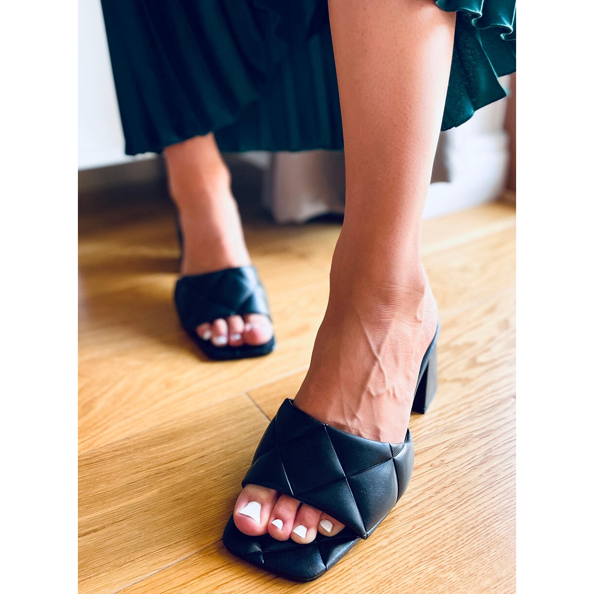 Otkrijte eleganciju i udobnost u Helen Black japankama sa širokom petom! Ove crne ženske papuče visine 7,5 cm savršena su nadopuna svakom stajlingu, savršene kako za svakodnevnu upotrebu tako i za posebne prilike. Njihov moderan, četvrtasti kroj i privlačan prošiveni uzorak privlače pažnju i dodaju klasu.