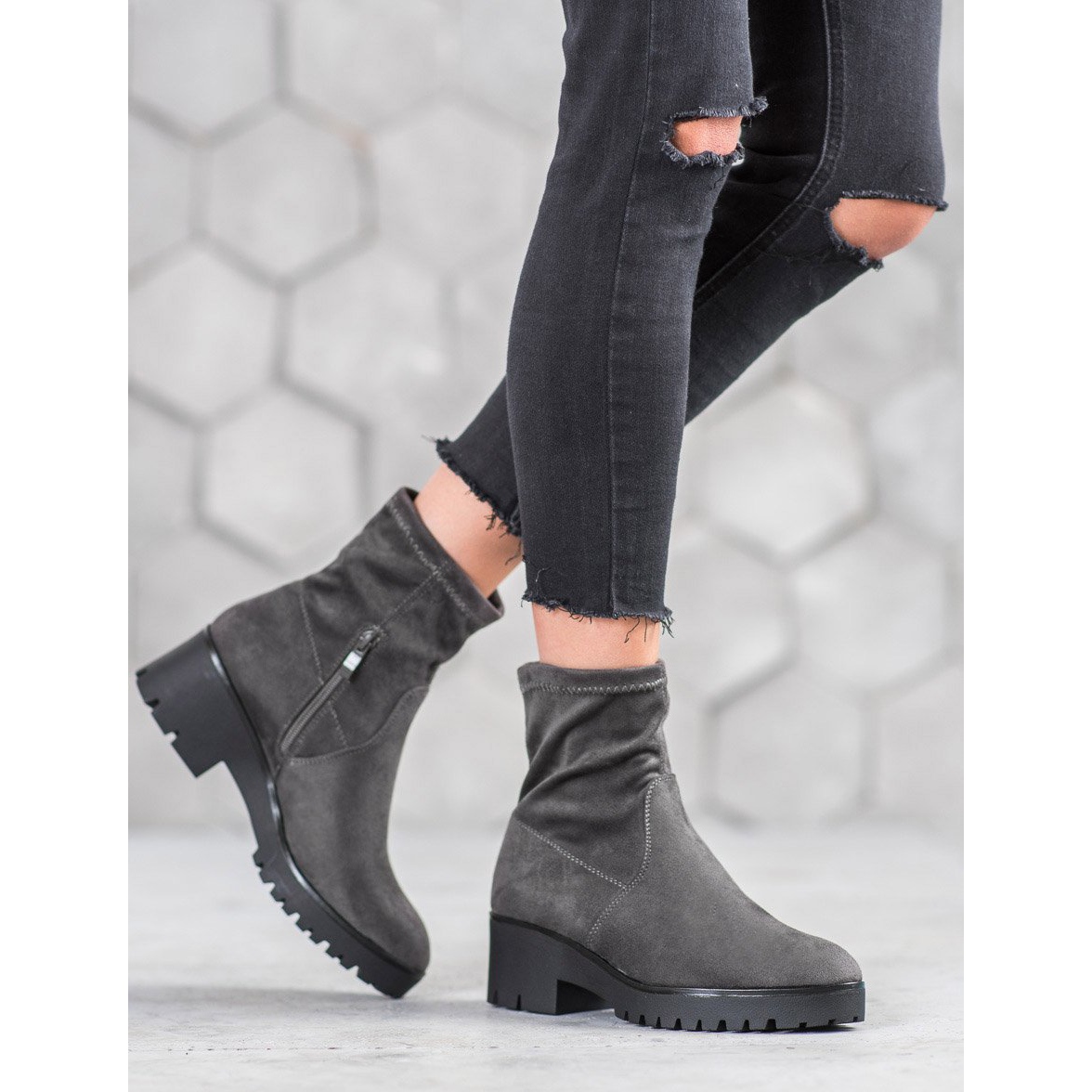 Dodajte malo stila i udobnosti u svoju garderobu uz SHELOVET gležnjače u sivoj boji. Ove moderne i praktične ženske cipele izrađene su od visokokvalitetnog ekološkog antilopa, što ih čini ne samo estetskim, već i ekološki prihvatljivim. Zahvaljujući čvrstom potplatu s gazištem, možete uživati u udobnosti i stabilnosti tijekom hodanja.