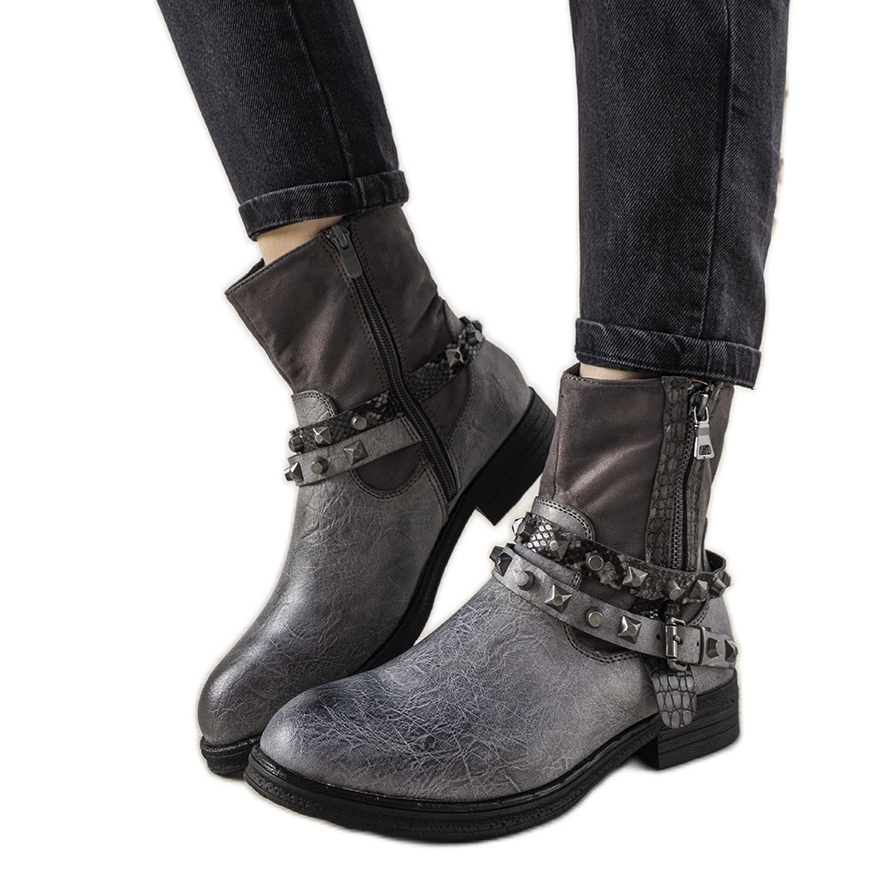 Elegantne ženske čizme u nijansi sive kombiniraju klasični, gležanj izrezan s kamenim naglaskom u obliku bendova ukrašenih klipovima. Izrađeni od kombiniranja ekološke i eko-eco-kože, oni će biti odličan dodatak jesenskim i zimskim stilizacijama.