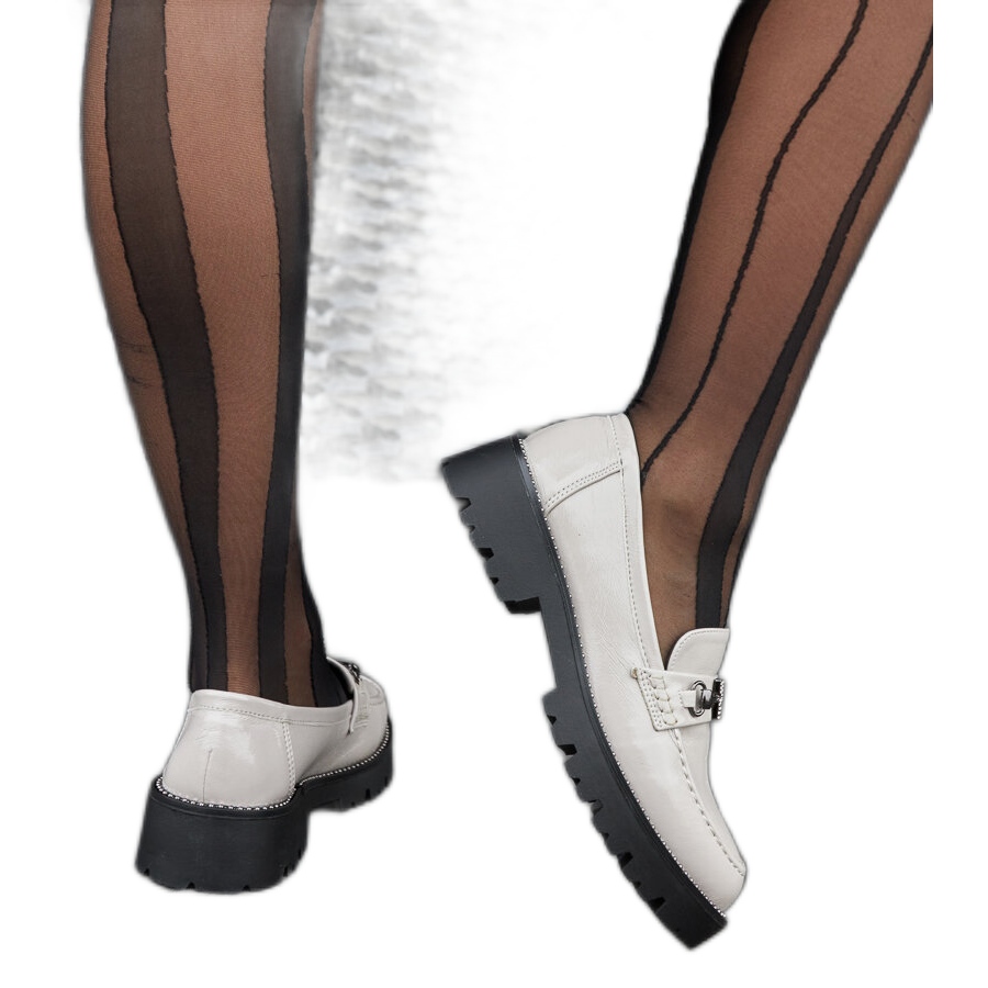 Moderne, niske lomace umetnute u L. Grey, koji kombiniraju udobnost s suptilnim sjajem. Izrađene od ekološke kože s lakiranim završetkom, s ukrasnim cirkonima, savršeni su i za ležerne i za sve formalne stilizacije. Intole od prirodne kože pruža udobnost, a guma, crni potplat jamči stisak i izdržljivost.