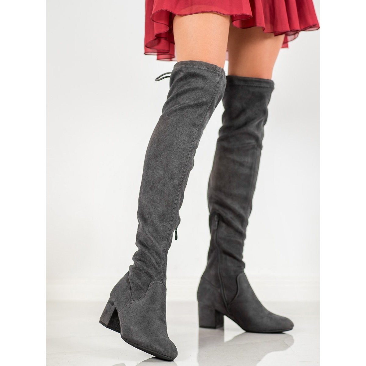 Ove jedinstvene cipele imaju gornji dio iznad koljena, koji savršeno ističe noge i daje vitku liniju. Gornja širina od 40 cm i ugrađena ojačana peta osiguravaju udobnost nošenja, a kopčanje na vezanje i patentni zatvarač olakšavaju obuvanje.