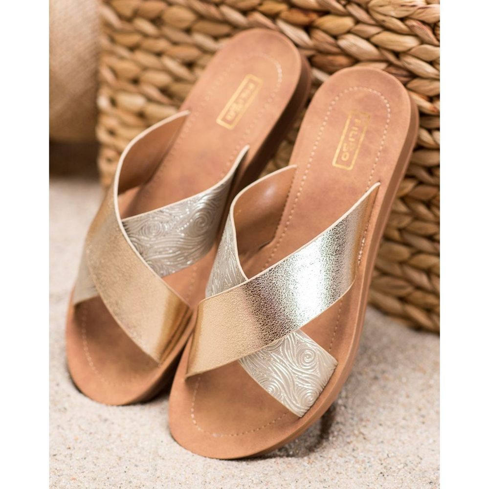 Otkrijte potpuno novu dimenziju udobnosti i stila uz sjajne japanke od eko kože brenda Filippo! Ove iznimno elegantne japanke u prekrasnoj zlatnoj boji savršen su odabir za svaku ženu koja želi unijeti malo sjaja u svoj svakodnevni stajling.