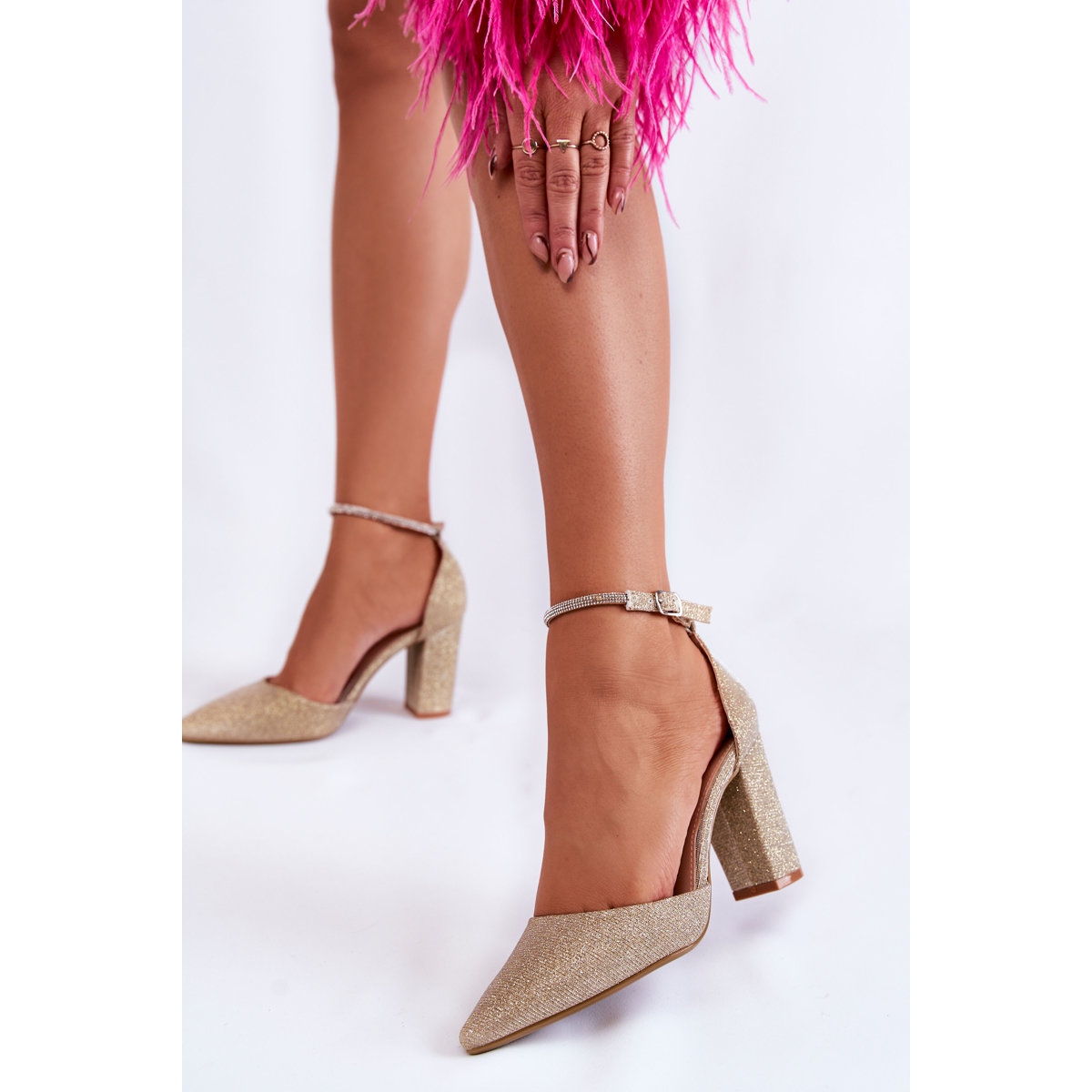 Otkrijte eleganciju i stil uz PS1 cipele u blistavoj zlatnoj boji! Ove moderne cipele sa stabilnom blok petom savršeno odgovaraju aktualnim trendovima, a istovremeno pružaju udobnost i sigurnost u vašem koraku. Pričvršćene oko gležnja podesivim remenom ukrašenim kamenčićima, ove salonke sa špicastim vrhovima savršene su za večernji izlazak, romantičnu večeru ili elegantnu zabavu.
