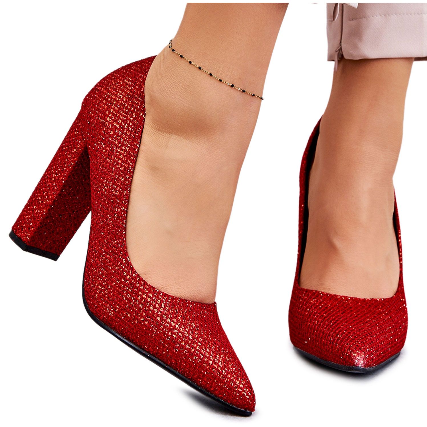 Sjajne brokatne pumpe na post - crveno