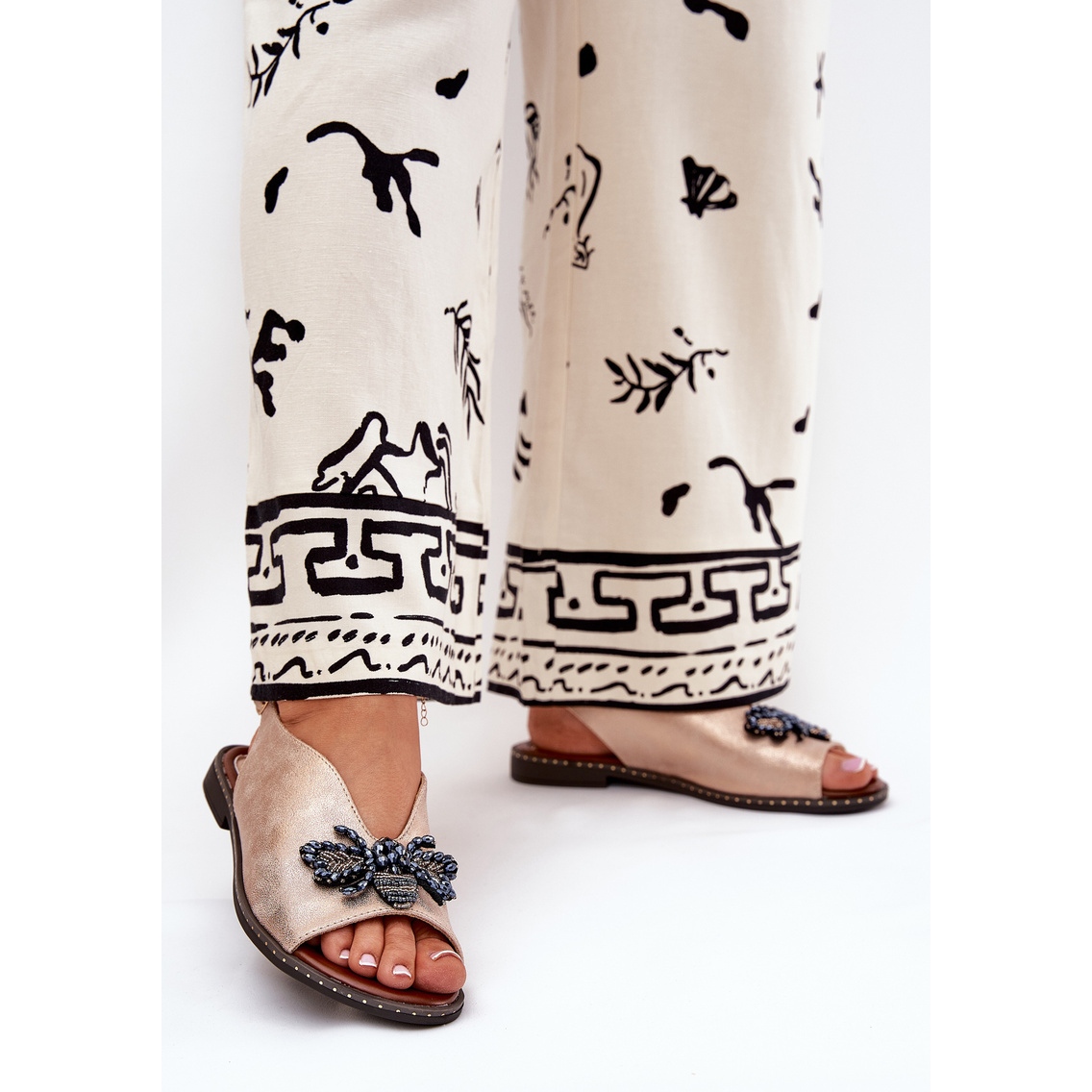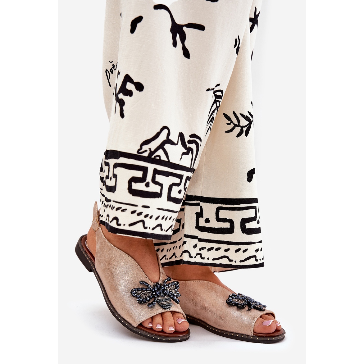 Sandale imaju ravnu petu s visinom od 1,5 cm, što pruža utjehu čak i tijekom dugih šetnji. Podesivi remen s kopčom omogućuje vam da se savršeno uklopite u stopalo, zahvaljujući kojem će se svaka žena osjećati samouvjereno i ugodno u njima. Delikatni ukras s cirkonima sprijeda daje im suptilnu eleganciju, zahvaljujući koje su savršene i za svakodnevne i za formalne stilizacije.