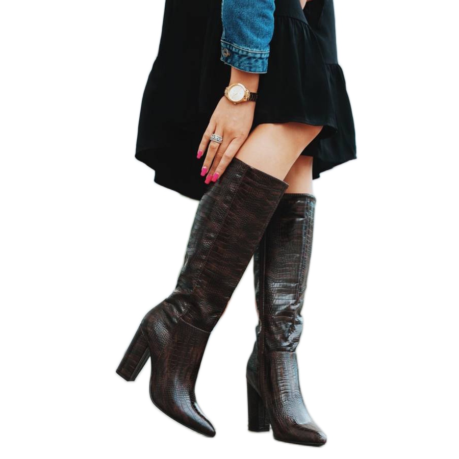 Predstavljamo smeđe Phoebo čizme na petu - savršen izbor za zimsku sezonu, koje će naglasiti vaš elegantan stil. Ove tamno smeđe čizme izrađene su od materijala nalik na kožu, a njihov nevjerojatan krokodilski uzorak daje im originalnost i jedinstven karakter.