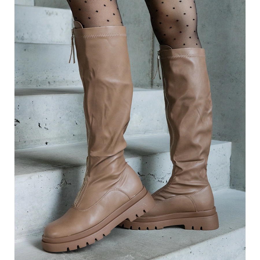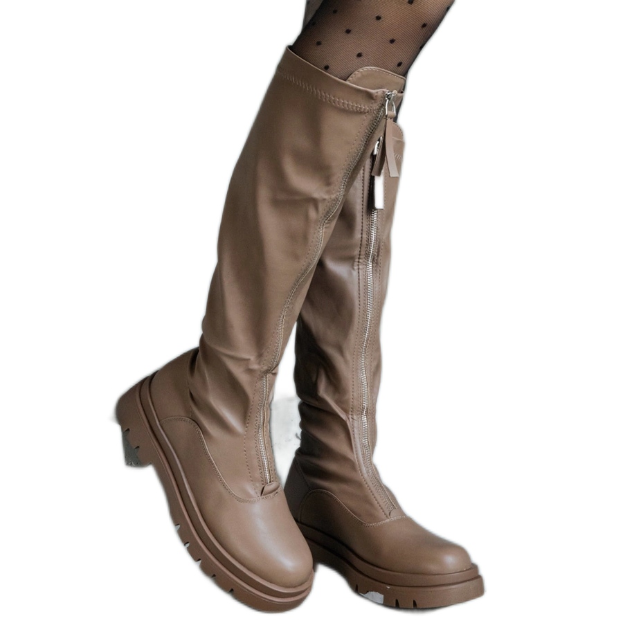 Imaju visinu koljena (49 cm) i imaju okrugli nos, što ne samo da naglašava njihov stil, već i pruža utjehu i prilikom nošenja. Zahvaljujući pričvršćivanju patentnih zatvarača, stavljanju i uklanjanju čizama, brzo je i ugodno. Smeđa boja, poznata kao kaki, i smeđi gumeni potplat savršena su kombinacija koja će dodati karakter bilo koje stilizacije.