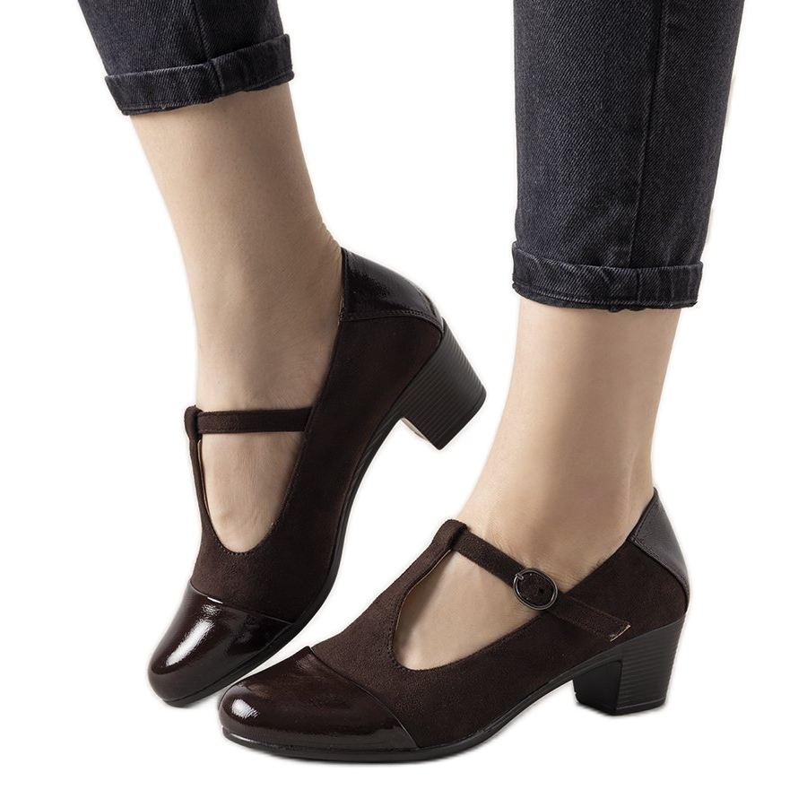 Pojedinosti: Smeđe pumpe na stupu s lakiranim desertnim prstom smeđa