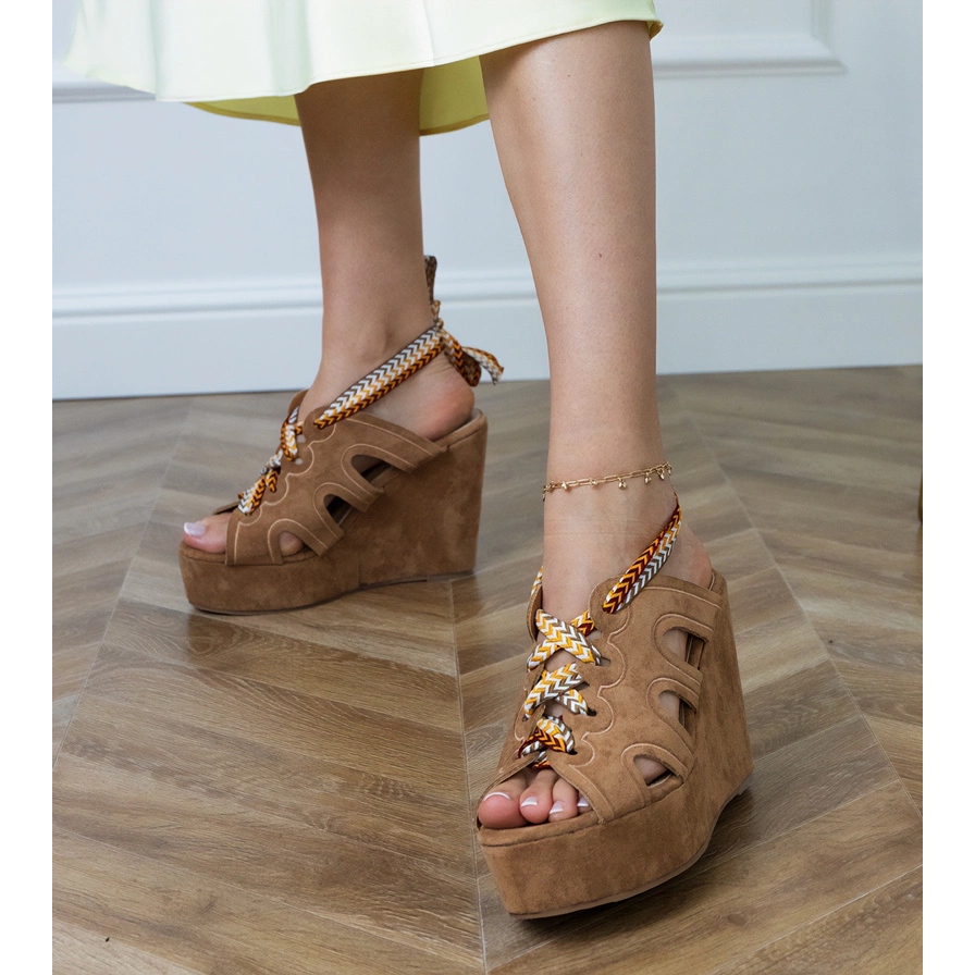 Detalji: Smeđe sandale klina s ukrasnim vezanjem smeđa
