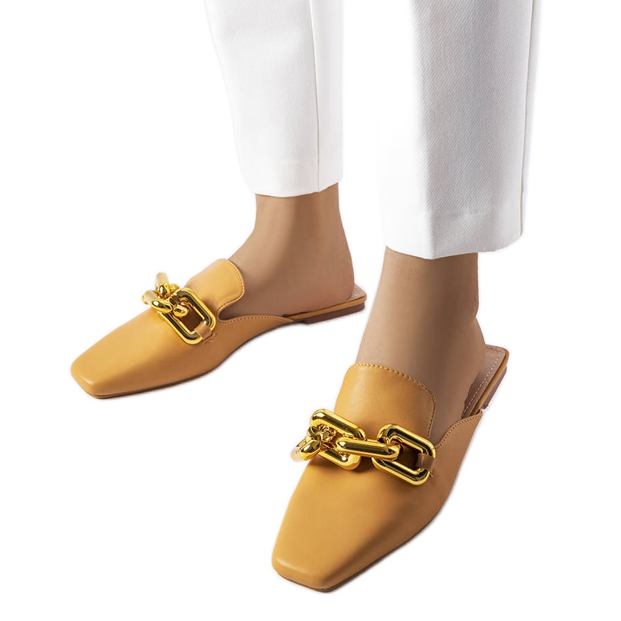 Moderne i udobne klizačke zaklopke koje će raditi ljeti, svakodnevne stilizacije. Izgrađeni gornji dio s kvadratnim, vitkim nosom i pomalo nepravilnoj završnici daje modelu moderan karakter, a debeli zlatni lanac naglašava elegantan naglasak. Izrađene od Eco -leather -izgledaju luksuzno, preostale kože -prijateljski i lako se brinu.