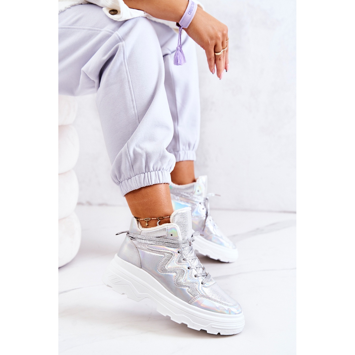 Moderne, visoke sportske cipele Joenne kombiniraju moderan, metalni sjaj s praktičnim izolacijskim svojstvima. Debeli, masivni potplat i meko krzno iznutra pružaju toplinu i udobnost tijekom hladnijih dana, a univerzalna srebrna boja dodati će karakter mnogim stilizacijama.