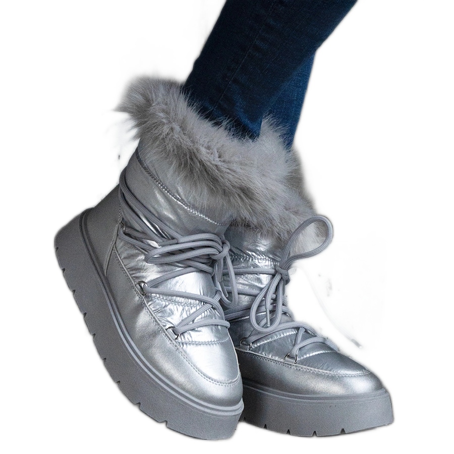 Detalji: Srebrne izolirane ženske čizme za snijeg s krznom srebro