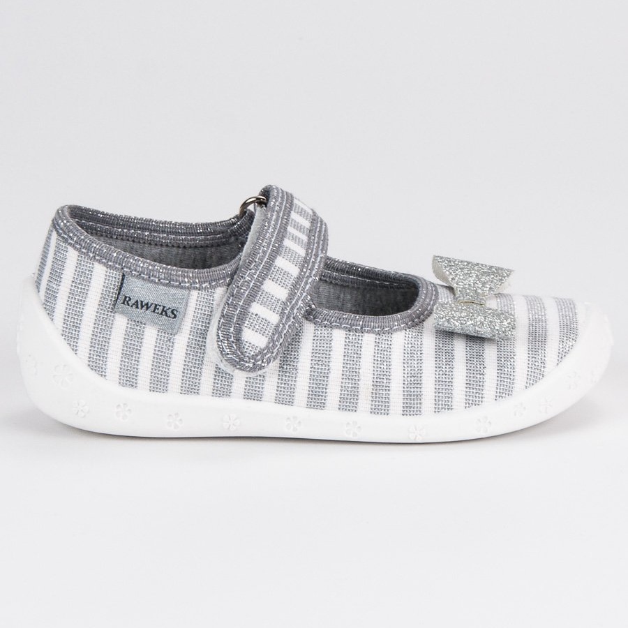 Moderne i praktične papuče za djevojčice iz Raweksa. Prednjica je ukrašena šarmantnom, sjajnom srebrnom mašnom, koja cipelama daje elegantan karakter. Velcro kopčanje omogućuje djetetu brzo i samostalno obuvanje, a kožni umeci osiguravaju udobnost i bolju cirkulaciju zraka tijekom nošenja. Izrađene od tkanine, savršene su za svakodnevnu upotrebu i kao nadopuna elegantnijoj odjeći.