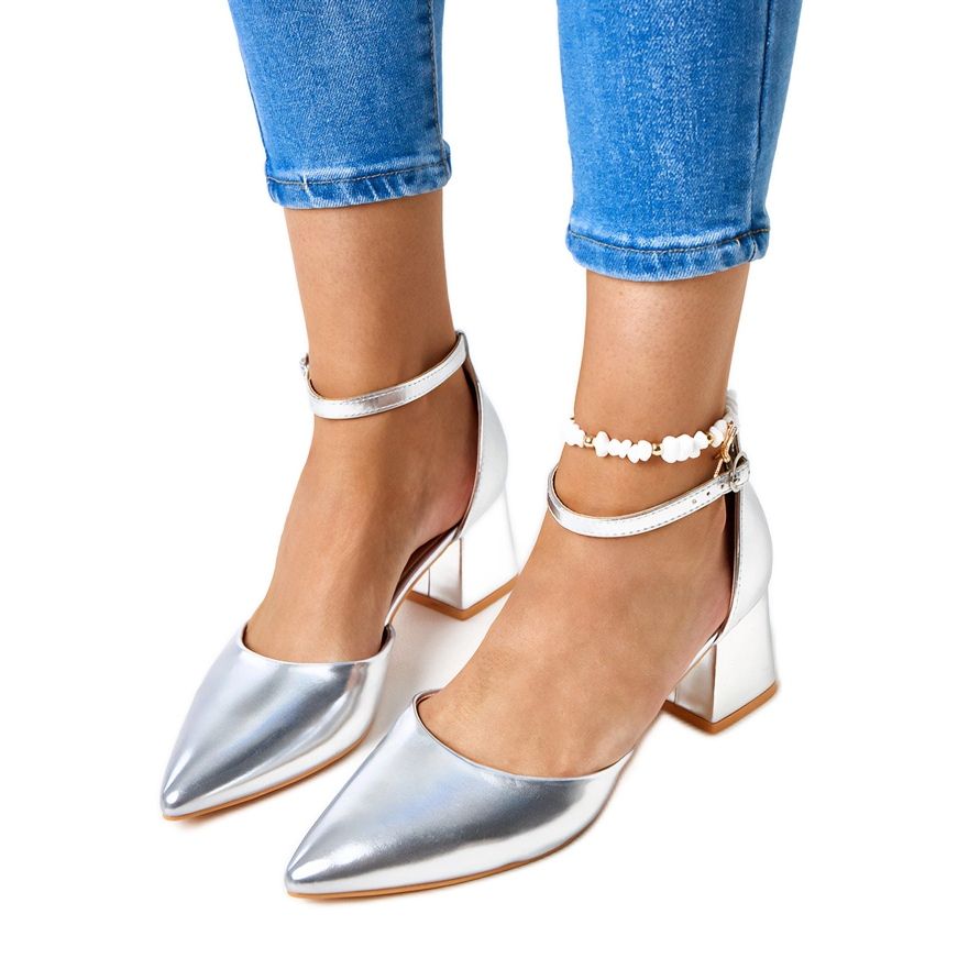 Srebrna boja dat će sjaj bilo koje stilizirane, a šiljasti nos daje im vrlo ženstveni karakter. Zahvaljujući visini pete od 6 cm, crpke su savršene za elegantne prigode i za svakodnevne kombinacije. Pričvršćivanje za kopče oko gležnja osigurava stabilnost i naglašava noge, a smeđi plastični potplat je i stilski i praktičan.