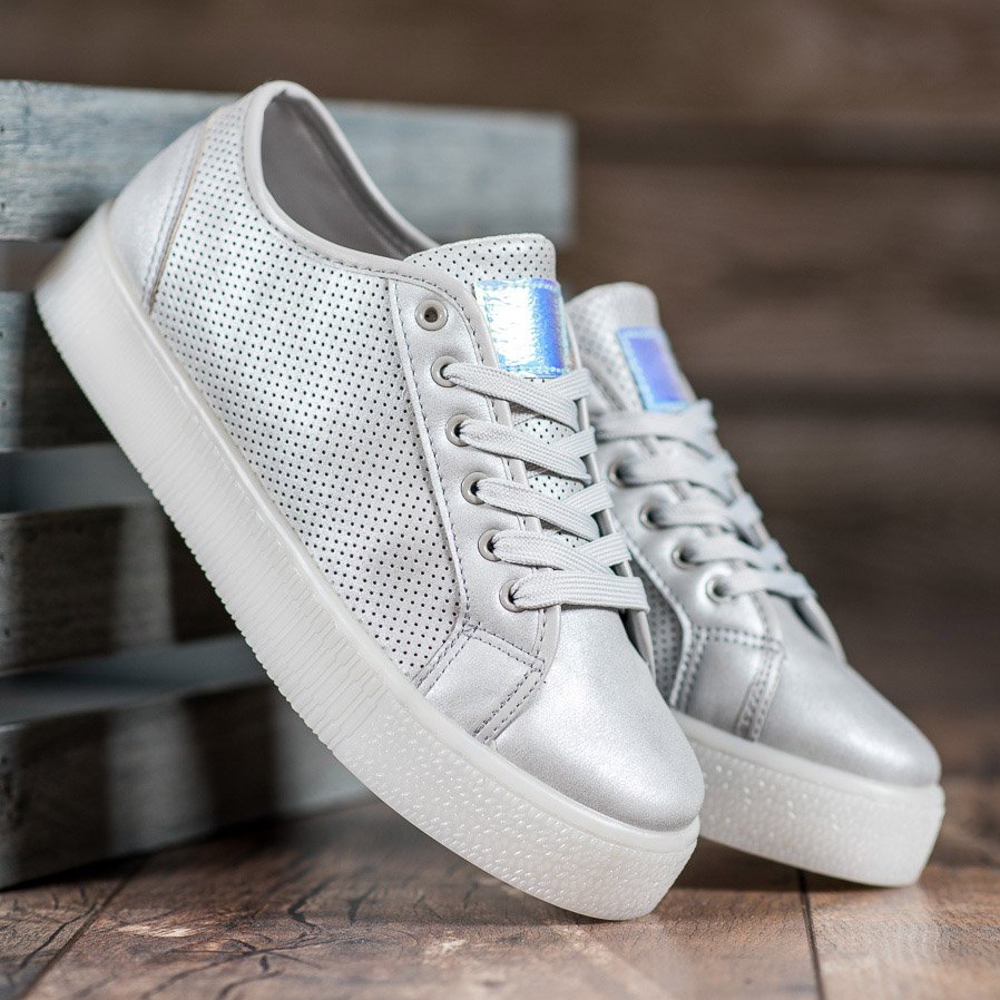 Srebrne tenisice s otvorenim uzorkom savršen su odabir za pastelne haljine i traperice, stvarajući nekonvencionalne i elegantne stilove. Zahvaljujući sintetičkom potplatu s gazištem i mekanoj peti, pružaju maksimalnu udobnost tijekom cijelog dana. Okrugli nos i kopčanje na vezanje daju im sportski karakter, a platforma od 2 centimetra čini ih ne samo udobnima, već i modernima.