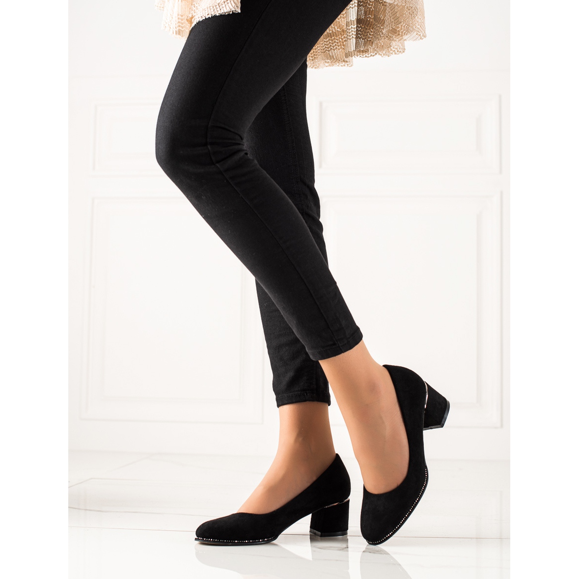 Izrađene od ekološki prihvatljivog umjetnog antilopa, ove cipele kombiniraju klasični stil s modernim prizvukom. Nježni kamenčići dodaju im sjaj, čineći ih elegantnim dodatkom svakom stajlingu. Okrugli vrh i blok peta visine 5 cm osiguravaju stabilnost i udobnost nošenja, što ih čini idealnim izborom za svako godišnje doba - proljeće, ljeto, jesen ili zimu.