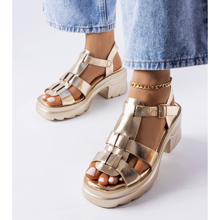 Dizajn sandala privlači pažnju zahvaljujući 7 cm visokim blok petama koje spajaju stabilnost i šik. Metalik sjaj, koji je dodatna značajka, ističe zlatnu završnicu Sunset modela, dodajući sjaj i privlačeći pažnju. Klasičan kroj je uvijek moderan, a četvrtasti vrh osigurava udobnost i daje prostora prstima.