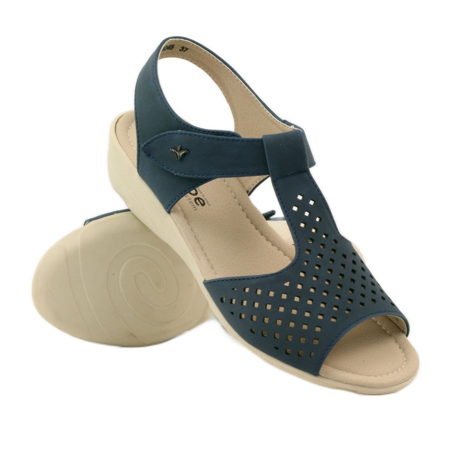 Evo savršenog rješenja za sve one koji traže udobnost i stil - tamnoplave ažur sandale španjolskog brenda AloeLoe, model wz.244045. Ove jedinstvene sandale, dizajnirane za osobe s osjetljivim stopalima, pružaju udobnost bez premca zahvaljujući korištenju visokokvalitetne, mekane ekološke kože.