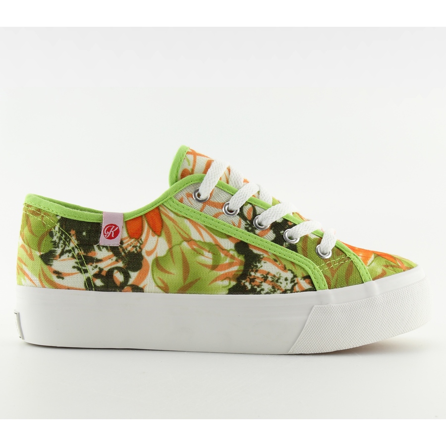 K145403 Višebojne tenisice s debelim potplatom - zelene, koje spajaju udobnost s modernim izgledom. Niske tenisice na vezanje na upečatljivoj bijeloj platformi visine 3 cm savršen su prijedlog za svaki dan - za posao, šetnju ili druženje s prijateljima. Nježni, cvjetni uzorak i sočna zelena boja dodaju lakoću i svježinu svakom stajlingu.