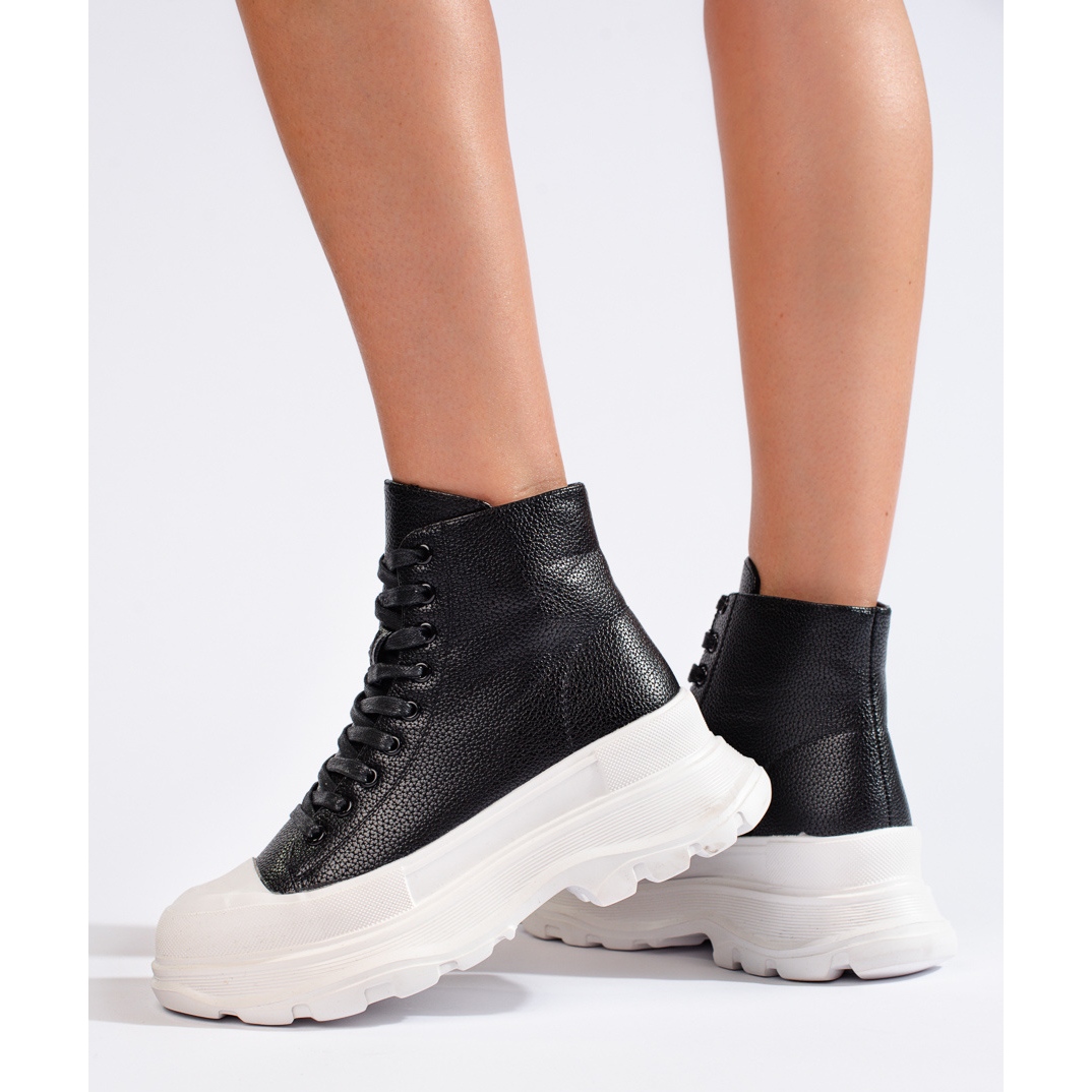 Izrađene od imitacije kože, tenisice se odlikuju visokom kvalitetom i izdržljivošću, što ih čini savršenim suputnikom u jesenskom i zimskom razdoblju. Potpetica je izgrađena i mekana, što osigurava udobnost nošenja čak i dugo vremena. Plastični potplat s gazištem jamči izvrsno prianjanje, a platforma visoka 6 cm vizualno dodaje visinu bez žrtvovanja udobnosti ravne pete.