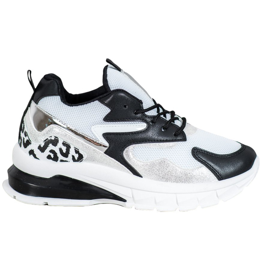 Izrađene od visokokvalitetnog materijala, vanjski dio cipela impresionira bijelim gornjištem ukrašenim crnim umetcima različitih oblika i veličina. Dodatno, tu su srebrni detalji sa strane i iznad pete, koji tenisicama daju jedinstven, moderan izgled. Mekana zatvorena potpetica i originalan ukras s točkastim motivom osiguravaju udobnost nošenja i istovremeno privlače pažnju.