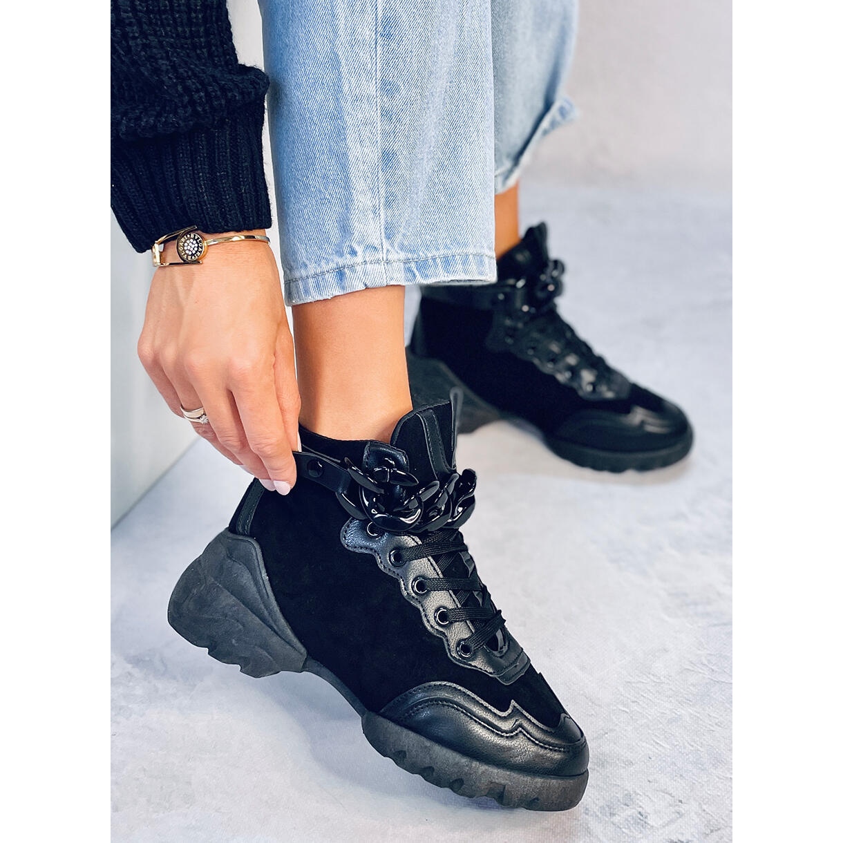 Moderne, crne ženske cipele Peri Black iz kolekcije Keeshoes Kombiniraju udobnost modela treninga s modernim, urbanim dizajnom. Odvojivi lanac daje im originalni lik - možete ih nositi u elegantnoj ili sportskoj verziji, ovisno o prigodu. Fleksibilan i elastični potplat i materijalna unutrašnjost jamče udobnost na svakom koraku.