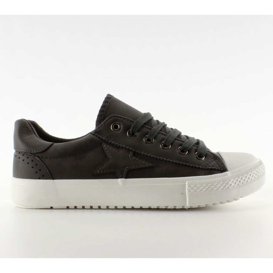 Klasične, niske ženske tenisice u univerzalnoj nijansi sive. Izrađene od eko kože, s unutrašnjosti obložene mekom tkaninom, osiguravaju udobnost i pri dugom nošenju. Karakter daje suptilna, izvezena zvijezda sa strane gornjeg dijela. Fleksibilan, elastičan potplat visine 2 cm jamči dobru amortizaciju i stabilnost, a kopčanje na vezice omogućuje prilagodbu cipele nozi.