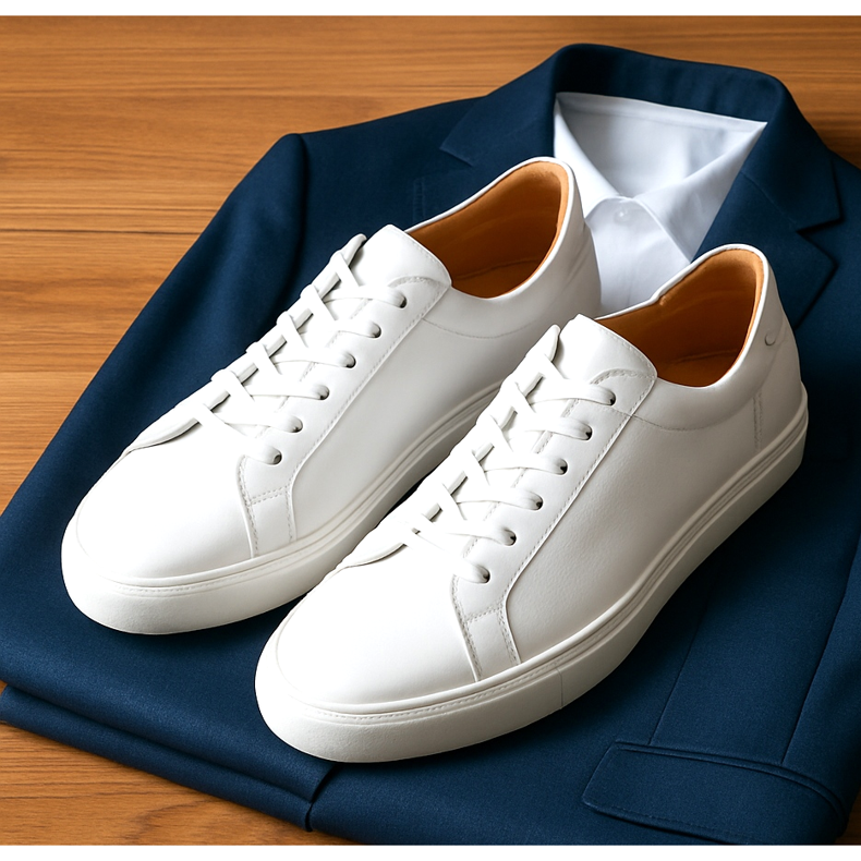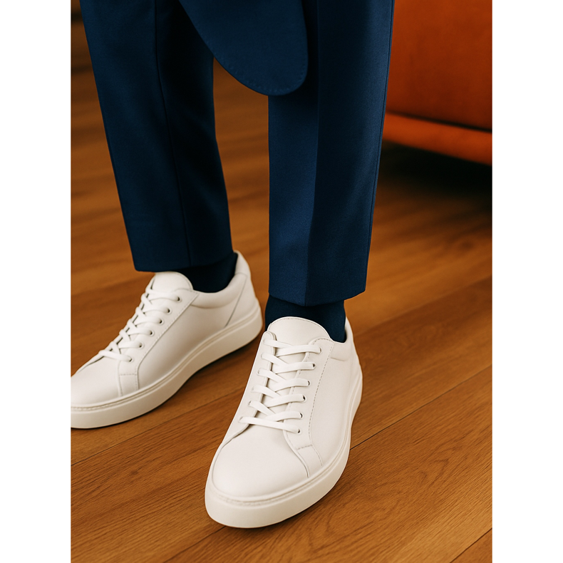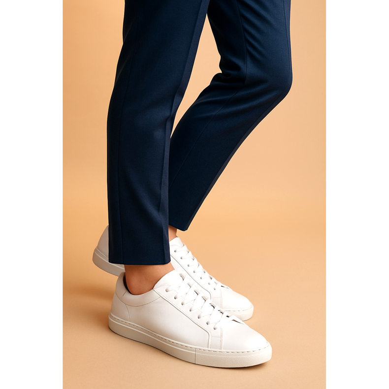 Ne ide svaka tenisica uz odijelo. Zaboravite na glomazne tenisice za trčanje ili iznošene tenisice iz teretane. Za elegantne hlače odaberite minimalističke modele uske siluete (tzv. low profile). Najsigurniji izbor su bijele, kožne tenisice bez nepotrebnih logotipa i šarenih umetaka. Čista bijela dodaje svježinu i savršeno se slaže s tamnoplavom, sivom i bež bojom.
