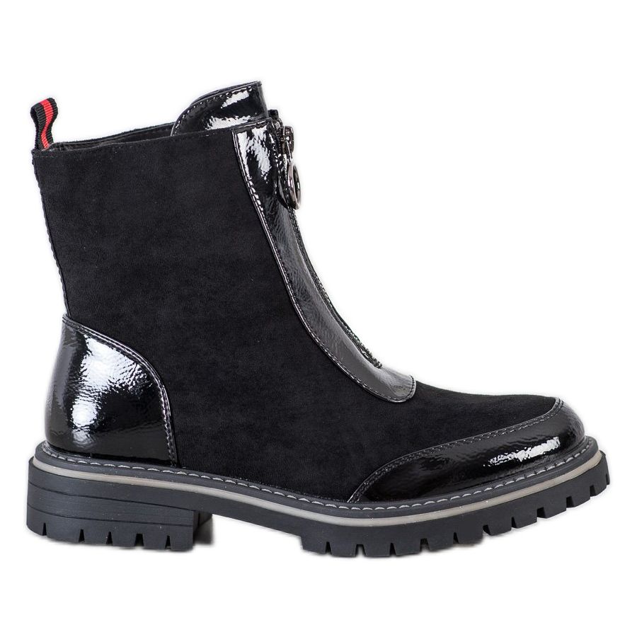 Zahvaljujući futurističkom izgledu, lakiranoj završnici i klasičnoj crnoj boji, ove čizme savršeno će se uklopiti u casual, rock stil. Plastični potplat s gazištem osigurava odgovarajuće prianjanje na različitim površinama, što je neophodno tijekom jesenskih i zimskih šetnji.