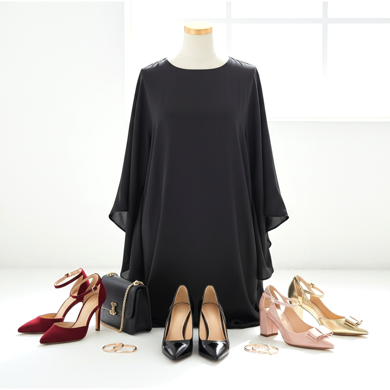 Crne visoke potpetice savršeno se slažu s crnom tunikom, stvarajući monokromatski, elegantan stajling. Možete odabrati i cipele u kontrastnoj boji - crvenoj, zlatnoj ili čak ružičastoj - koje će oživjeti cijeli outfit i dati mu karakter.