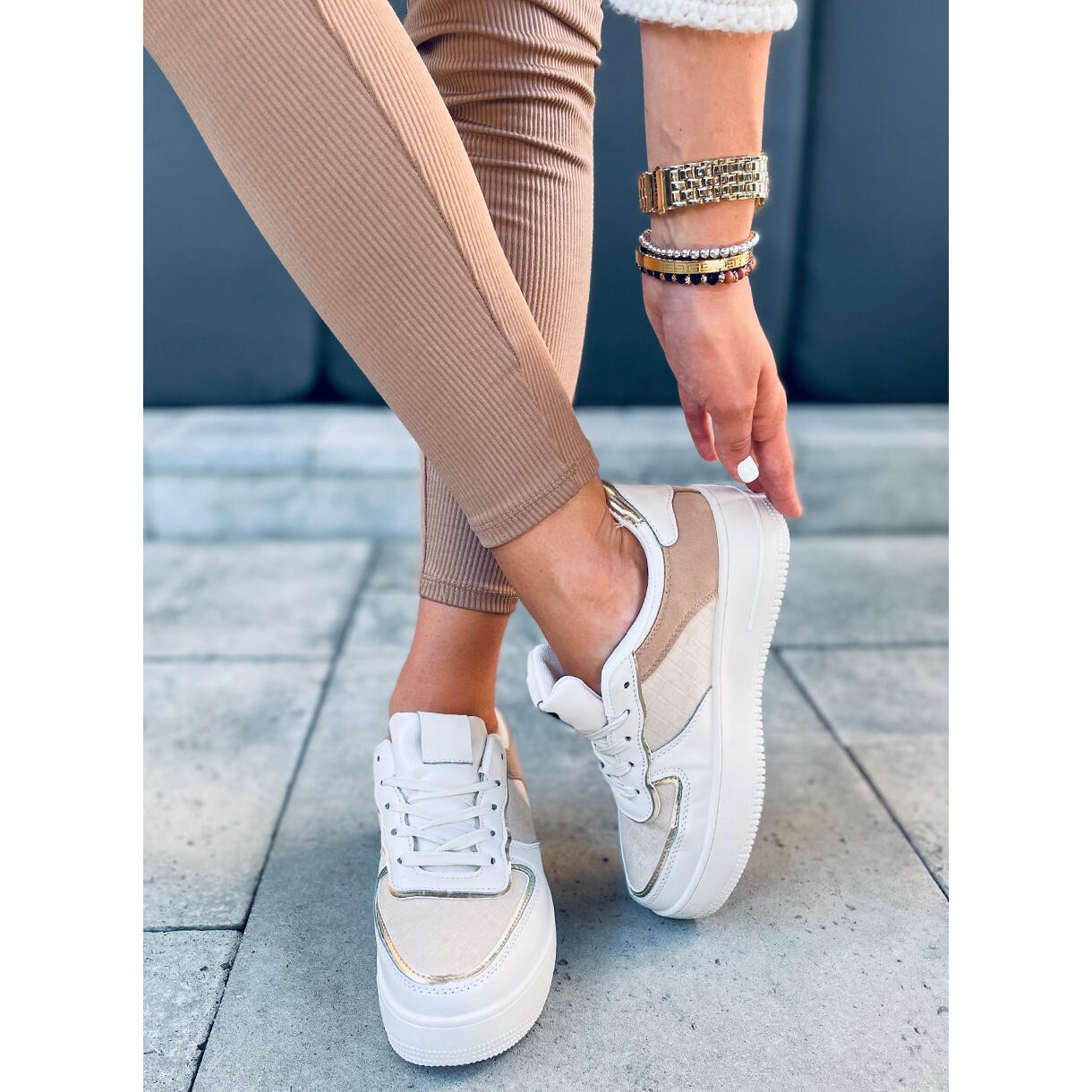 Sportske cipele Ujusti u bež boji savršen su izbor za žene koje cijene stil i udobnost. Ove cipele na vezanje s visokim potplatom (4,5 cm) odlikuju se modernim glamuroznim uzorkom i upečatljivim metalnim umetcima koji privlače pozornost i dodaju karakter svakom stajlingu.