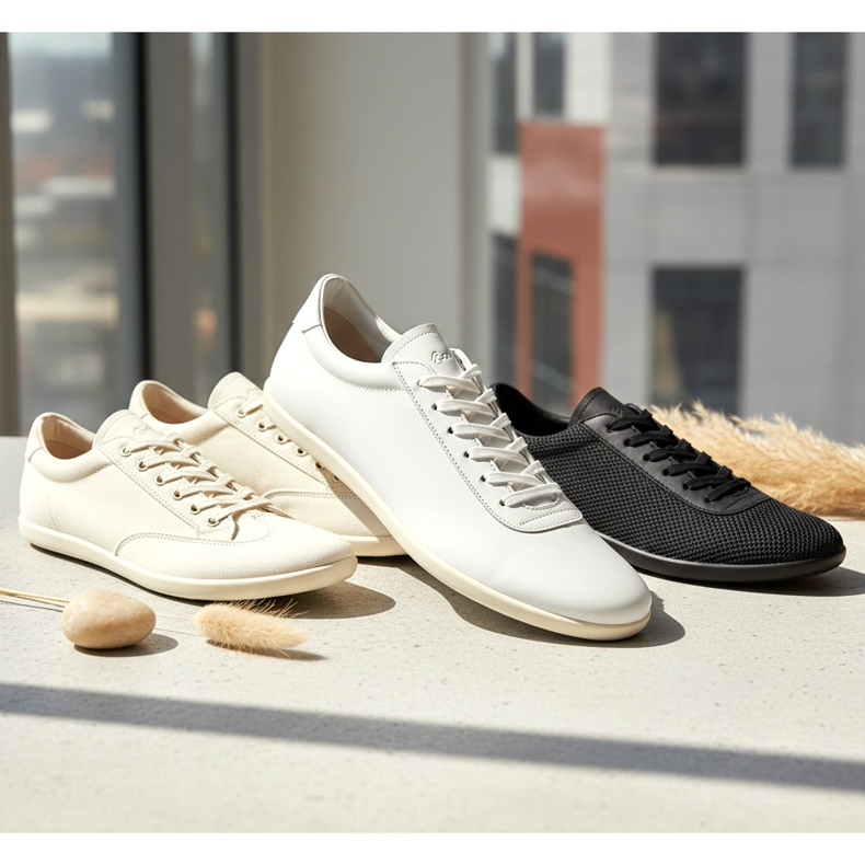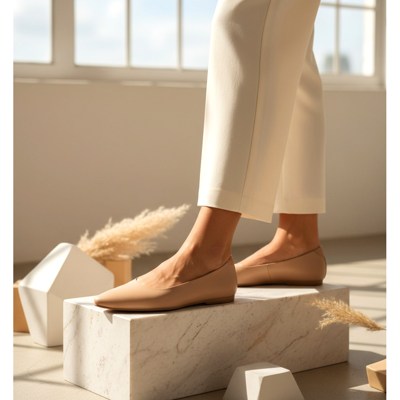 Međutim, ultra-tanak dizajn cipela — njen tanak profil i izduženi vrh — često nadoknađuje nedostatak pete. Noge u takvim cipelama izgledaju duže nego u tradicionalnim ravnim tenisicama s okruglim vrhom i debelim potplatom. Par u boji slične vašoj koži ili bež posebno se preporuča nižim osobama - učinak optičkog produljenja je itekako vidljiv.