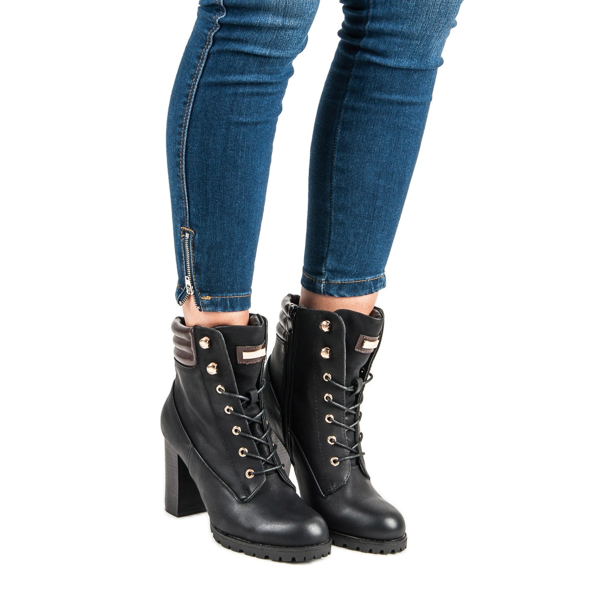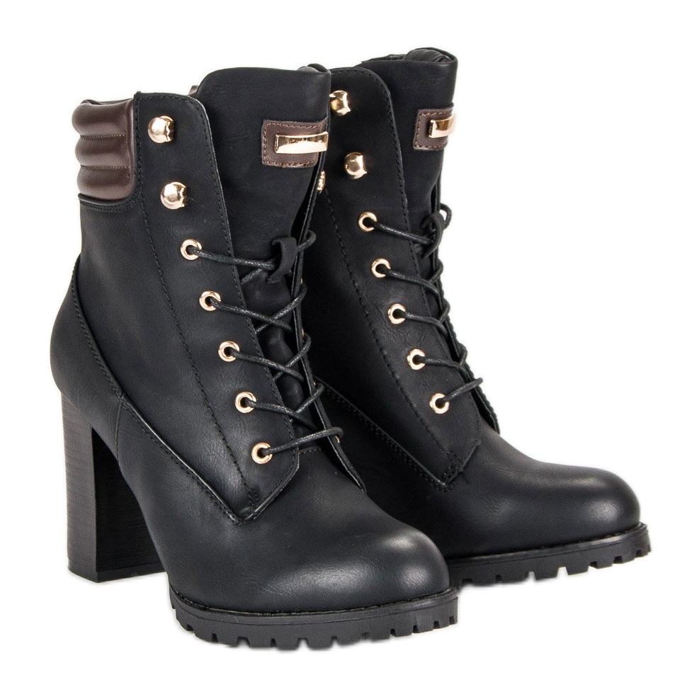 Otkrijte eleganciju uz KAYLA gležnjače na visoku petu u klasičnoj crnoj boji. Ove elegantne cipele, ukrašene smeđim i zlatnim detaljima, savršene su za casual i elegantniji stil. Imaju šipku od 9 centimetara koja daje eleganciju, kao i patentni zatvarač i nježne vezice koje olakšavaju obuvanje.