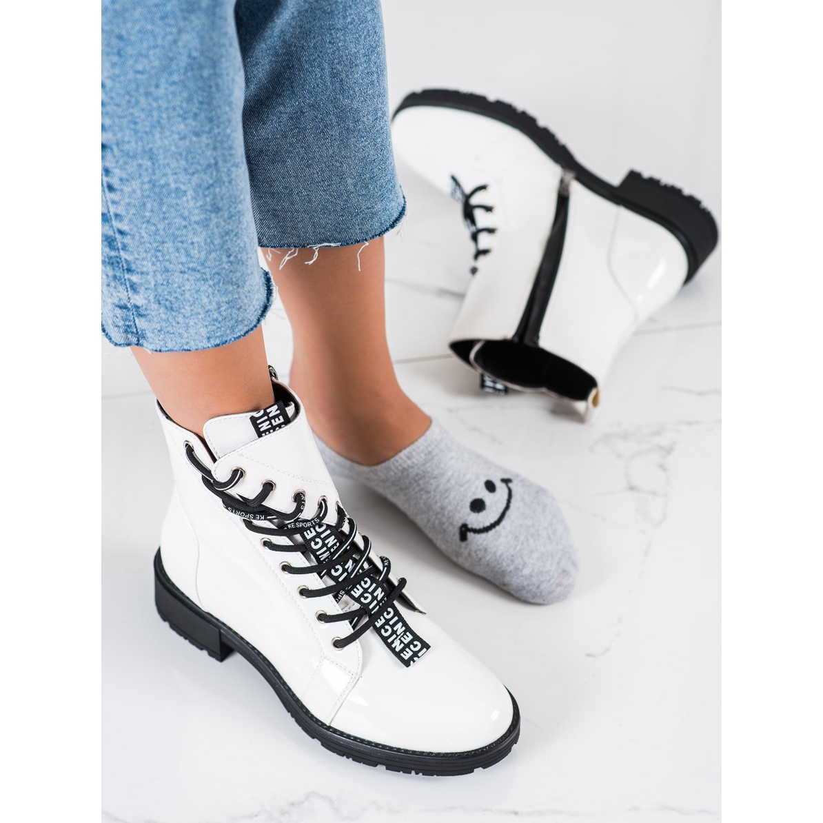 Praktičan patentni zatvarač i detalji na vezanje olakšavaju obuvanje, a gornjište visine 14 cm i širine 24 cm savršeno pristaje uz nogu. Bijele boje i zaobljeni prsti čine ove radnje iznimno univerzalnima - savršeno se slažu s raznim stilovima, od traperica do haljina, dodajući malo sirovog šika.