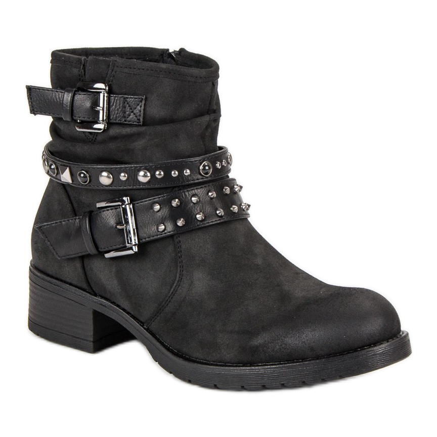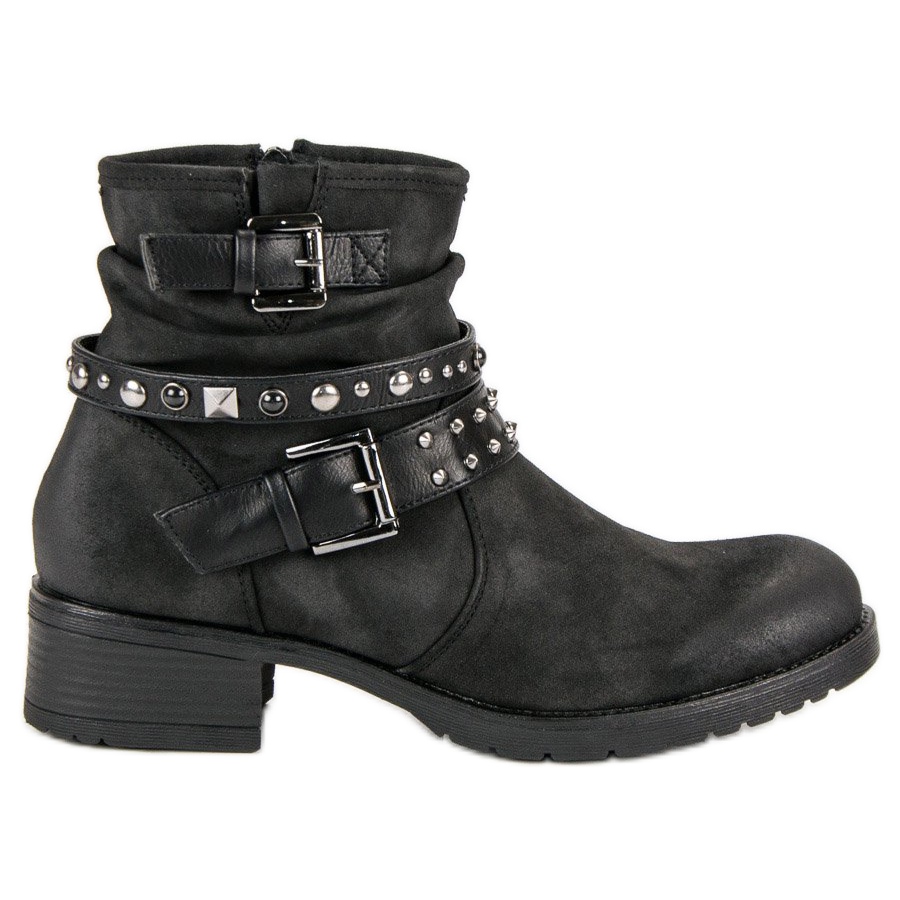 VINCEZA crne radnice savršen su izbor za svaku hrabru ženu koja se želi istaknuti iz mase. Ove elegantne čizme, izrađene od visokokvalitetne ekološke kože, spajaju eleganciju s modernim dizajnom. Njihove karakteristične ukrasne kopče i detalji u obliku kamenčića i nitni daju im rock, jedinstven karakter, savršeno pristajući casual stilu.