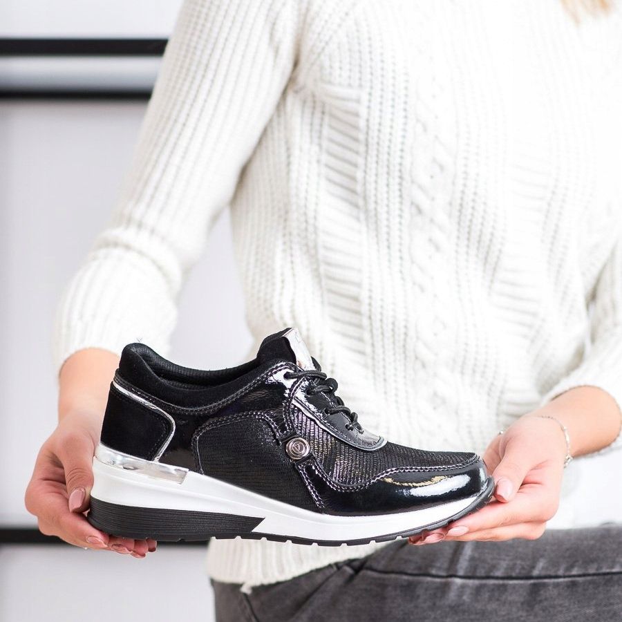 Crne VINCEZA tenisice karakterizira niska visina, što ih čini savršenim za svako godišnje doba, bez obzira na godišnje doba. Zahvaljujući platformi visokoj 5 cm, možete uživati u suptilnom podizanju koje dodaje lakoću silueti. Okrugli vrh i ugrađena, mekana peta povećavaju udobnost nošenja, a kopčanje na vezice omogućuje savršeno pristajanje uz nogu.