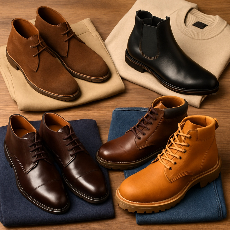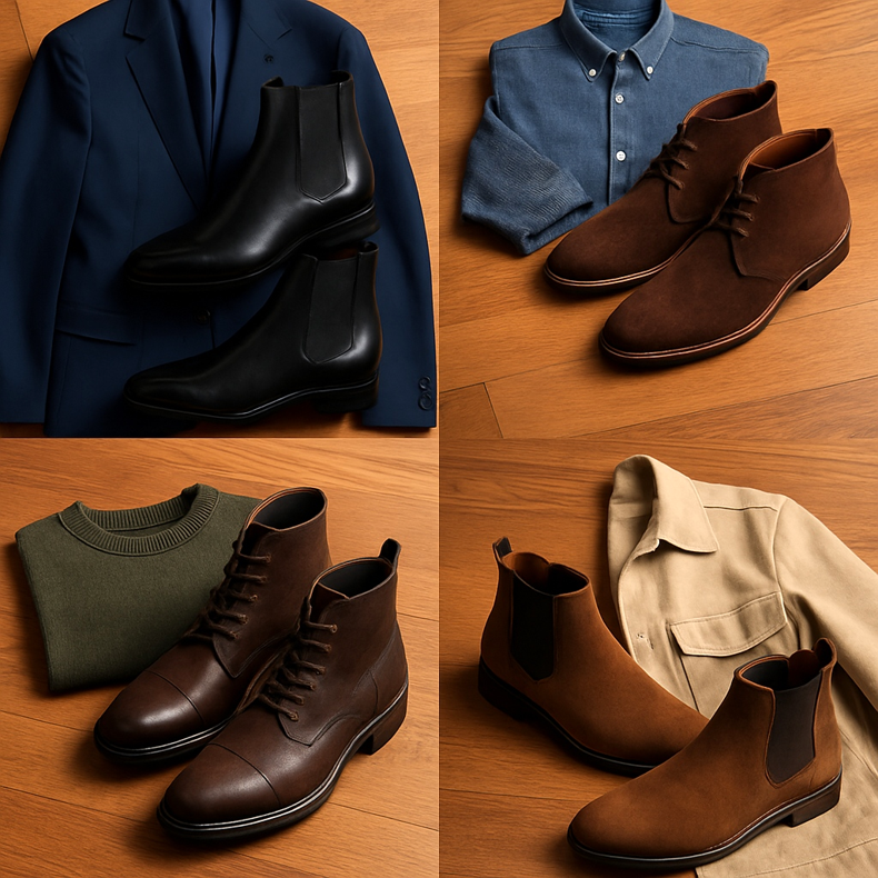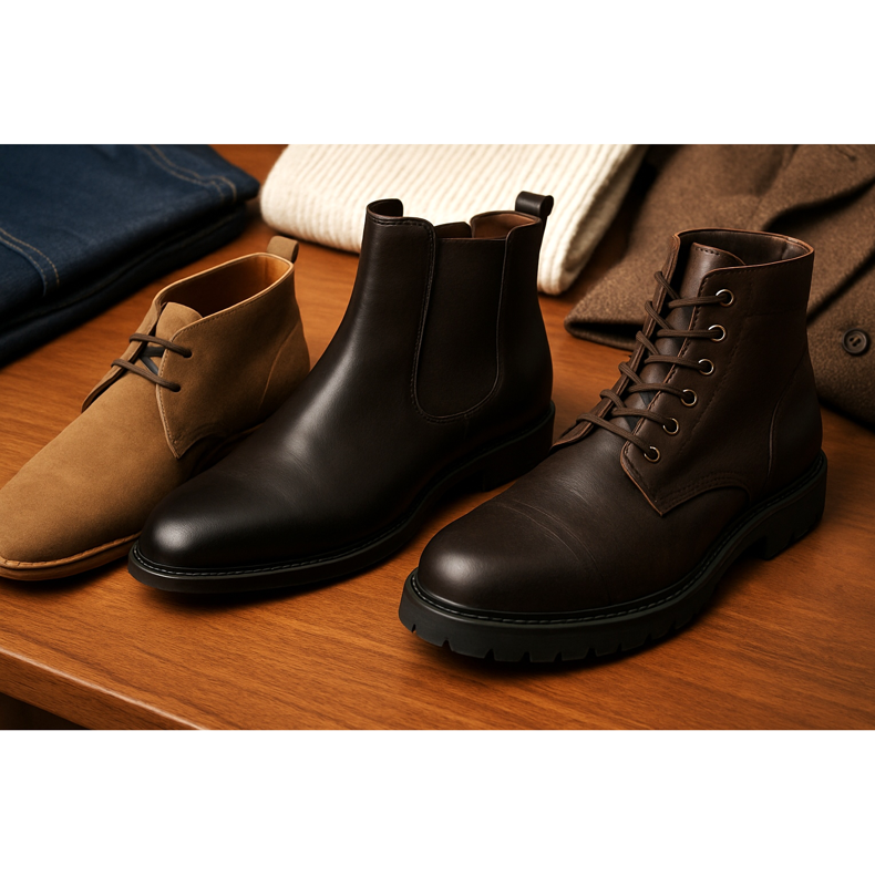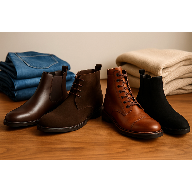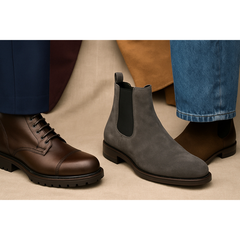 - Rast — niži muškarci: birajte tanke modele (Chelsea, uske čukke) umjesto masivnih čizama torba.