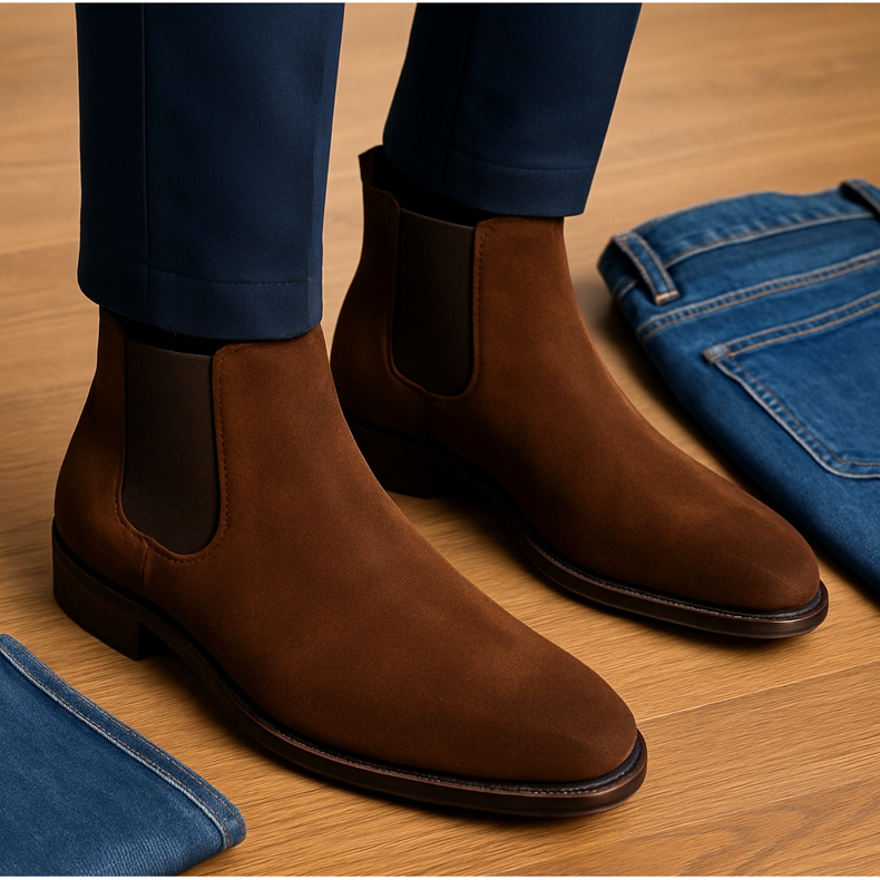 Chelsea čizme (crno/smeđe) ili derbi čizme u zrnatoj završnici. Izbjegavajte debele potplate i antilop u vrlo formalnim okruženjima.
