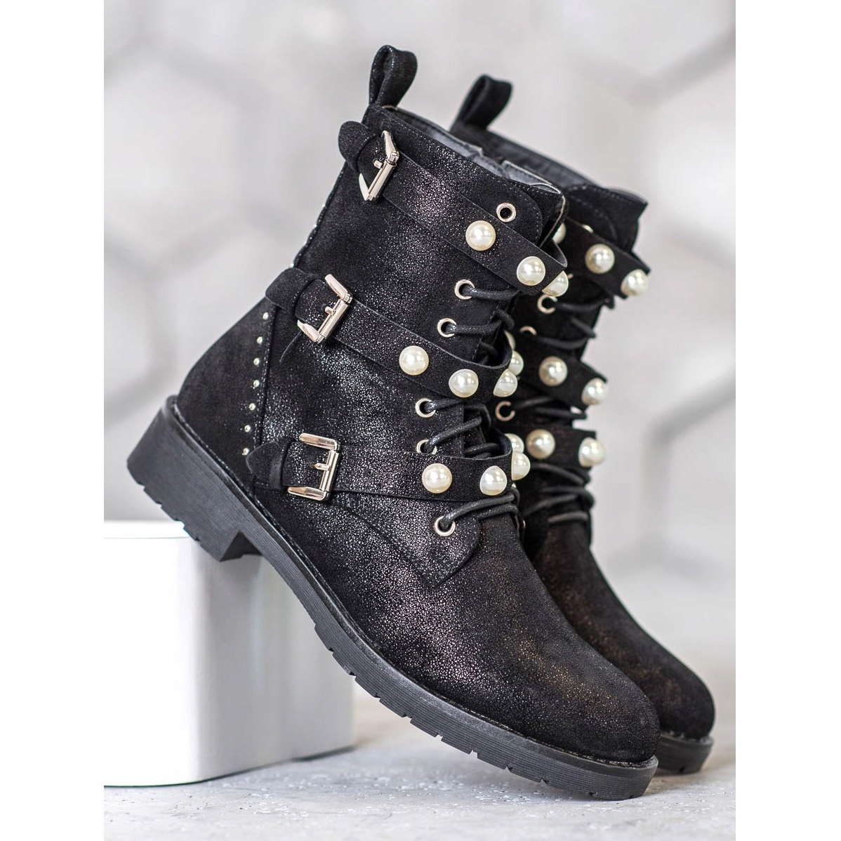 Ove elegantne čizme imaju vezivanje sprijeda i praktični patentni zatvarač sa strane, što ih čini jednostavnim za obuvanje i izuvanje. Dodatno, njihov izvorni izgled naglašavaju remeni s kopčama ukrašeni biserima i sitnim sjajnim kamenčićima koji im daju rock karakter.