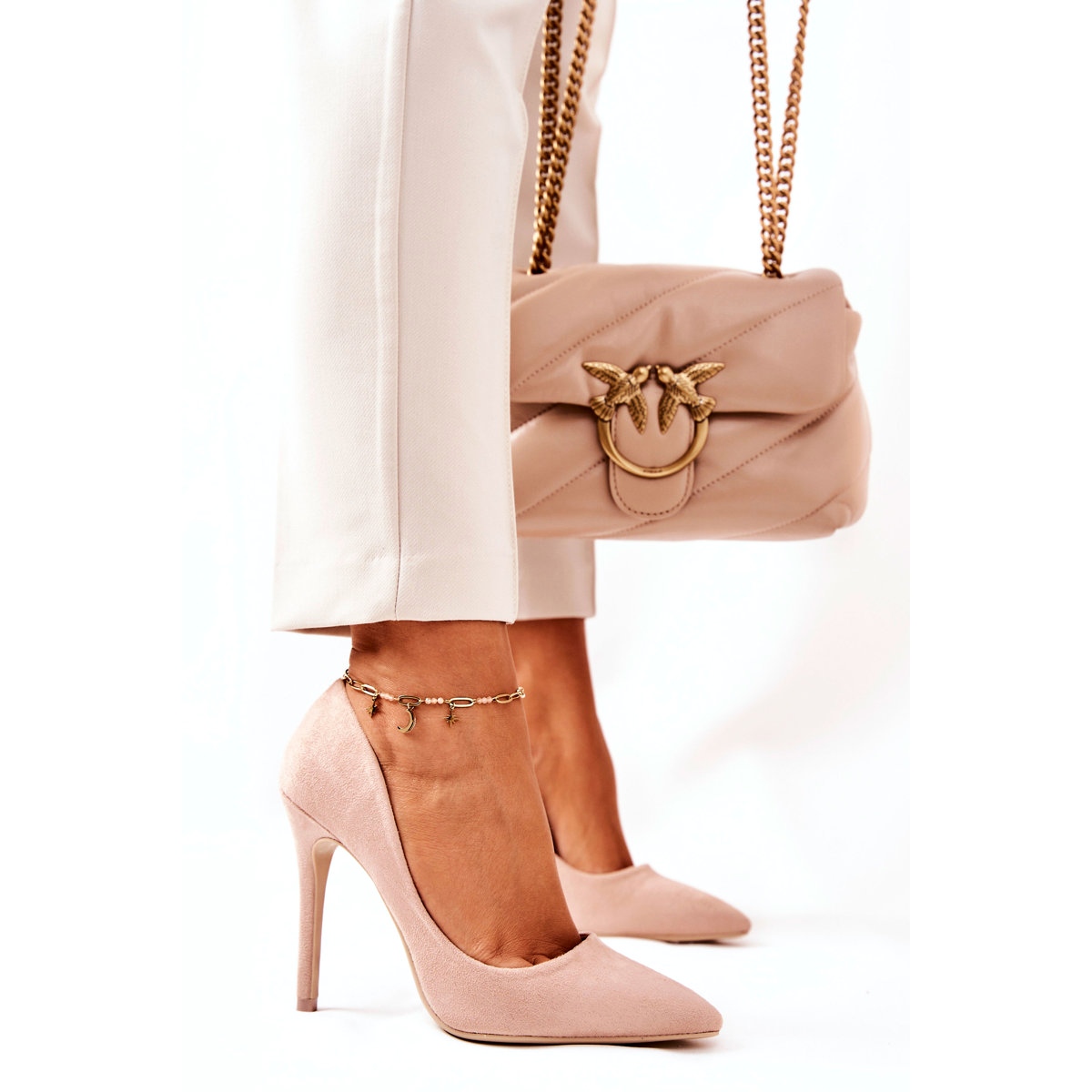 Model s petom visine 10,5 cm ističe se šiljatim vrhom i protukliznim potplatom koji povećava stabilnost pri hodu. Bež boja i završna obrada antilopa čine ove visoke pete pristajajućim uz različite stilove, savršeno pristajajući uz haljine, hlače i suknje.