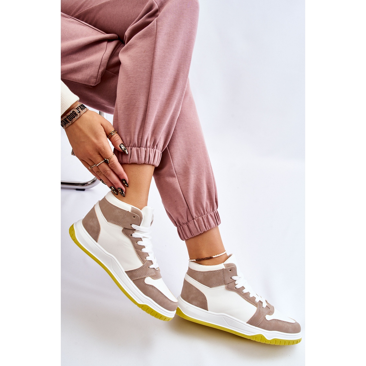 Predstavljamo vam visoke ženske sportske cipele BM Rumor u atraktivnoj bijeloj i bež boji. Ove moderne tenisice odlikuju se elegantnim dizajnom i funkcionalnošću, što ih čini idealnim izborom za svakodnevnu upotrebu.