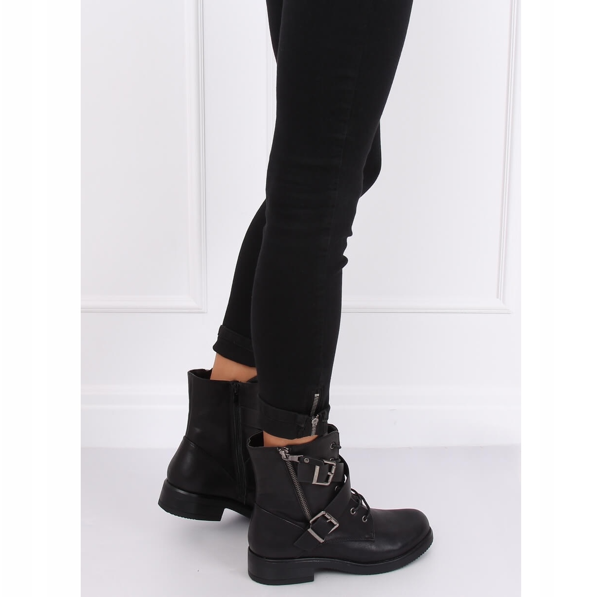 C581 Crne vojne radničke čizme savršen su izbor za žene koje cijene stil i udobnost. Ove ravne čizme na vezanje savršeno odgovaraju aktualnim modnim trendovima, kombinirajući klasičan dizajn s modernim detaljima. Ukrižene naramenice s kopčama daju im karakter, a istovremeno ih čine univerzalnima – savršenima za svakodnevni styling.