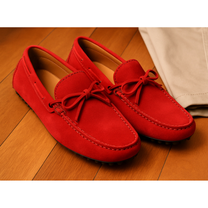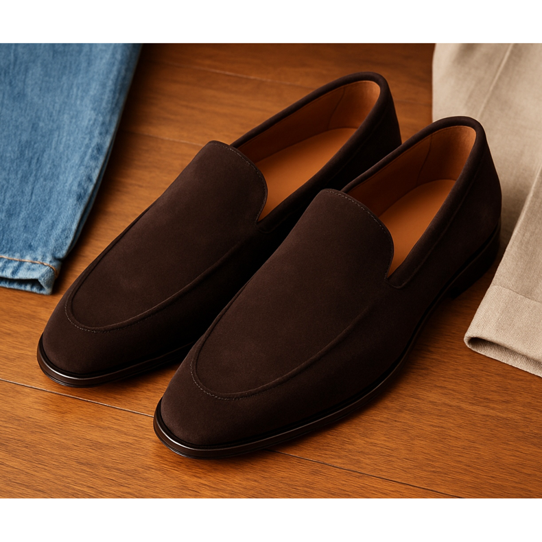 Mokasine s resicama od brušene kože + tamne traperice + polo/ležerna košulja.