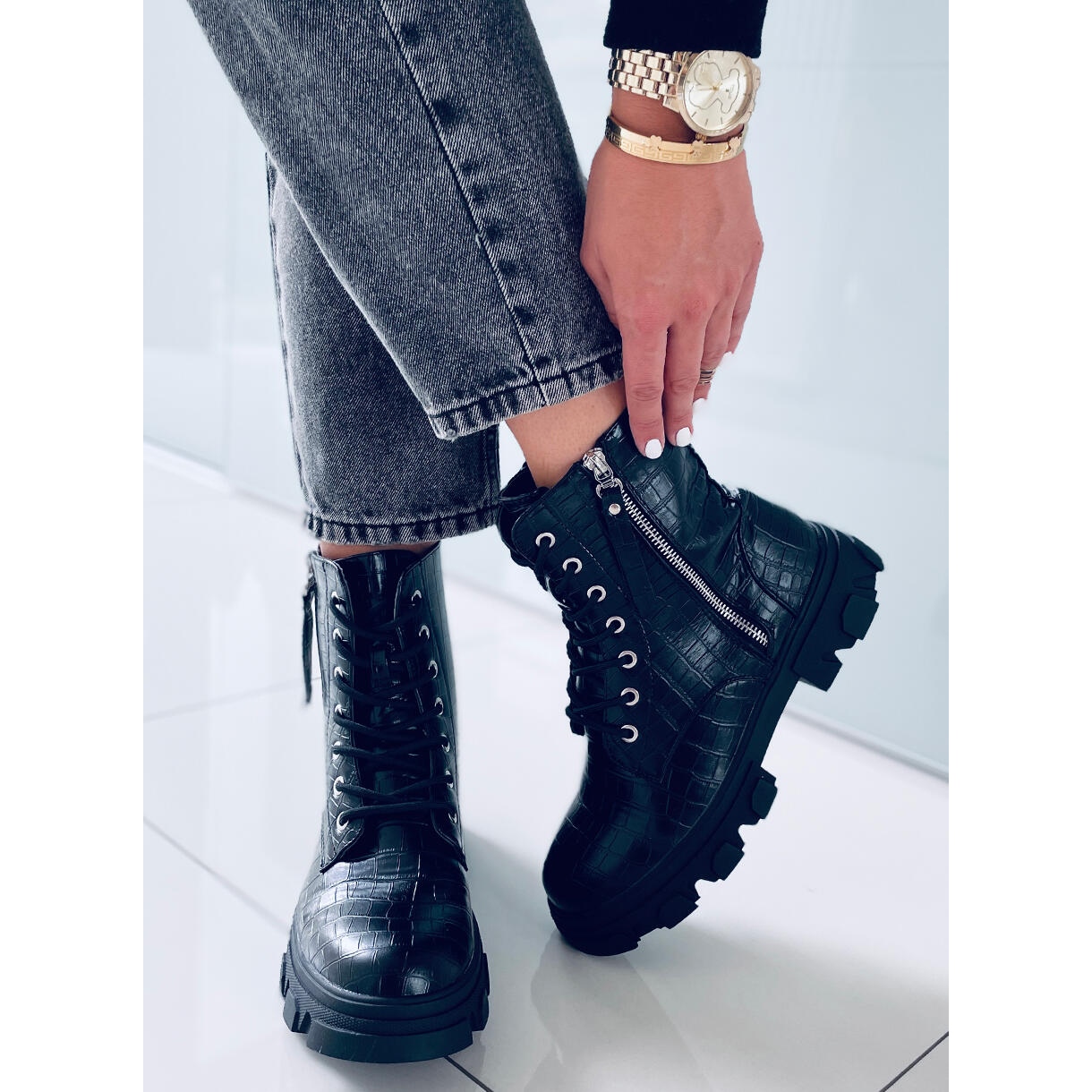 Ovaj model karakterizira udobno kopčanje na vezanje i dodatni patentni zatvarač koji obuvanje i izuvanje čini izuzetno lakim. Još jedna prednost je univerzalna crna boja koja se savršeno uklapa u svakodnevne stilove, a ujedno je savršena za odvažnije, vojničke lookove.