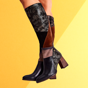 Volite li se igrati s modom, odaberite originalne čizme s proširenim gornjištem. Ovaj model je savršen za žene s debelim listovima. Četvrtasti vrh, kestenjasta boja kože s motivom zmije i stabilna šiljka provjereni su odabir za mnoge zimske stilizacije.