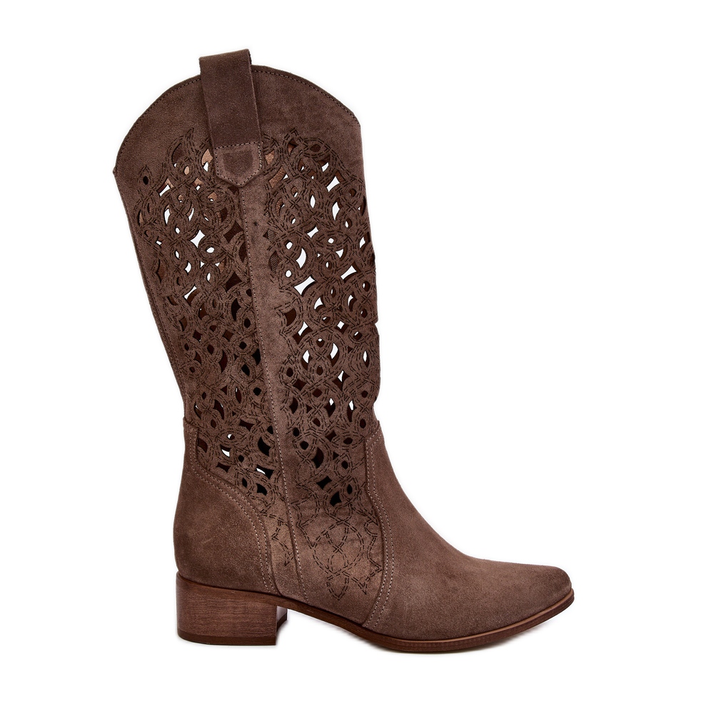 Zazoo 3403 Ženske otvorene čizme na nisku petu u tamno bež boji jedinstven su prijedlog za žene koje cijene kombinaciju elegancije i udobnosti. Izrađene od visokokvalitetnog prirodnog antilopa, ove cipele nisu samo elegantne, već su i izdržljive i ugodne na dodir. Karakterističan ažurni uzorak na gornjištu ne samo da lijepo izgleda na nozi, već osigurava i bolju prozračnost stopala, što je posebno vrijedno u toplijim danima.
