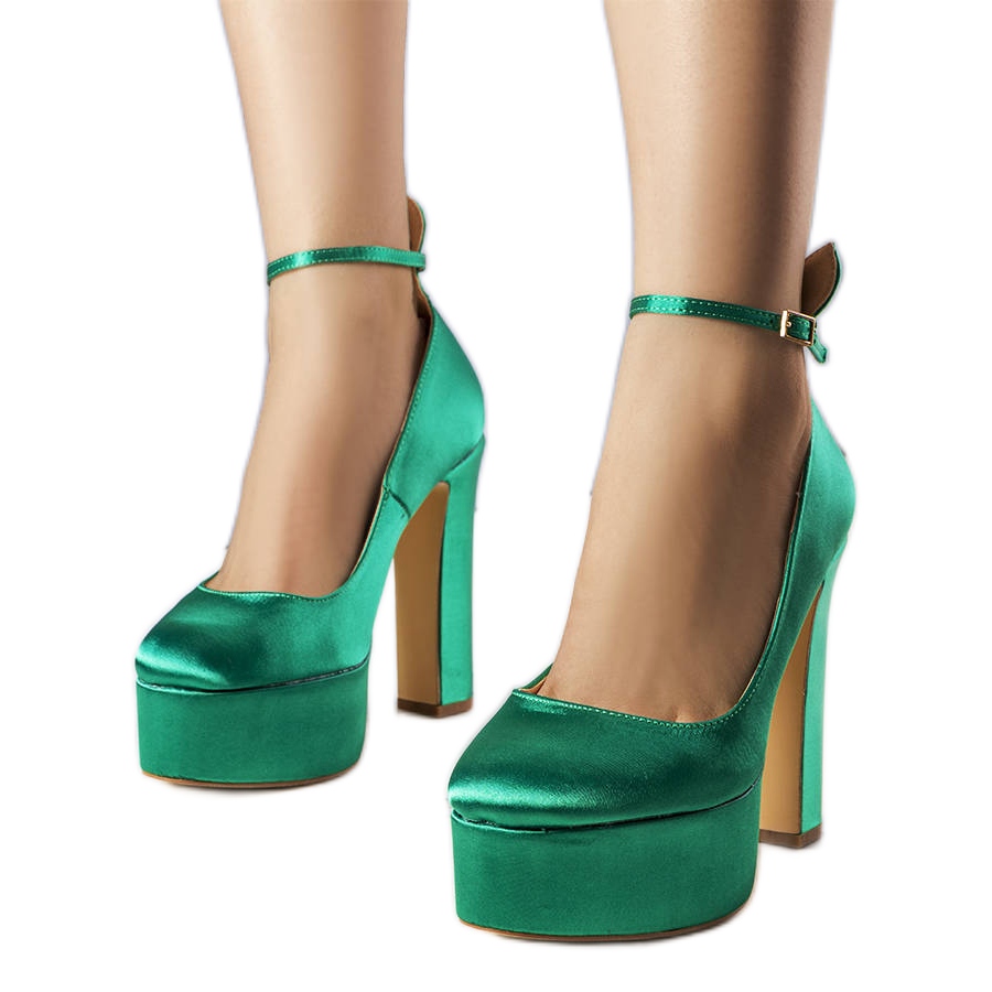 Zelene pumpe na visokoj lilaskoj post - eleganciji i izražajnom naglasku u jednom. Napravljeni od satenske tkanine u dubokom nijansi zelene boje, kombiniraju klasični rez s modernim karakterom. Vitki, okrugli nos i tanki remen s kopčama gležnja naglašavaju žensku figuru, a visoki, obloženi post s dodatnom platformom optički produžuje noge i pruža stabilniji korak.