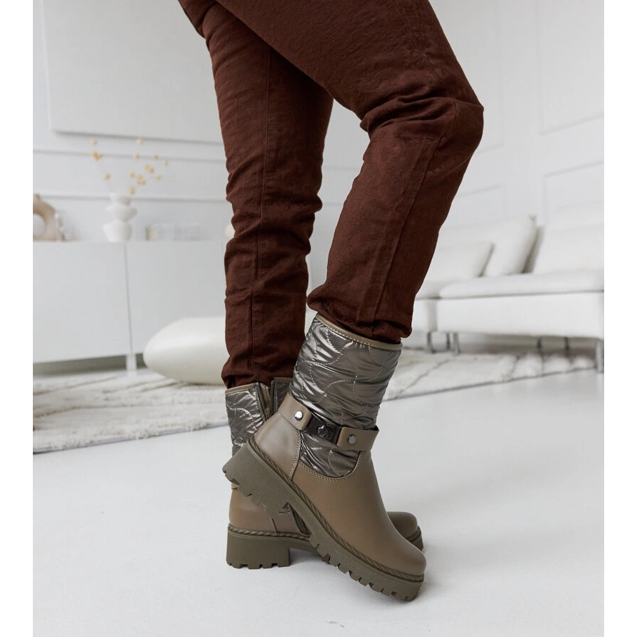 Elegantne lido čizme u kaki boji kombinacija je modernog dizajna i praktičnosti. Izolirani dizajn učinkovito štiti od niskih temperatura, a gležanj do gležnja (visok 24,5 cm) čini model prikladnim i za svakodnevne i za elegantne stilizacije. Dekorativni remen dodaje karakter, dok ravna peta s visinom od 4,5 cm jamči udobnost nošenja cijeli dan. Zipper sa strane olakšava stavljanje i skidanje.