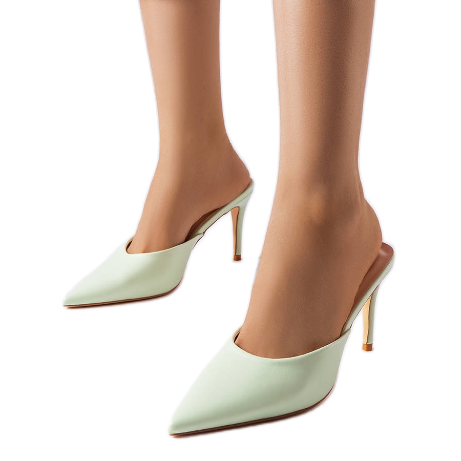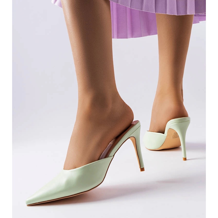 Zeleni okretni proleti na prsluku za odvod - učinkovit naglasak za ljetne stilizacije. Vitak, 10 cm pin i izduženi nos u Spitz suptilno naglašavaju žensku figuru, a otkrivena peta dodaje lakoću i ljetni karakter. Napravljena u cijelosti od ekološke kože u dubokoj, prigušenoj nijansi zelene boje (boja proizvođača: zelena) - elegantna i univerzalna.