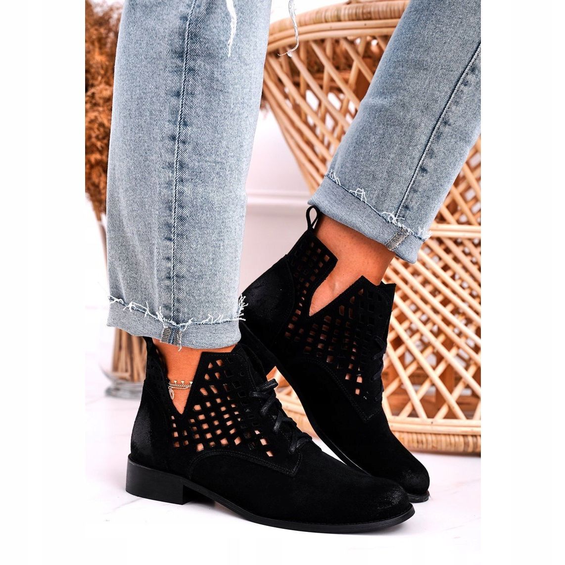 Otkrijte jedinstveni stil i udobnost nošenja s ženskim ažurnim crnim gležnjačama od brušene kože Susannah poljskog brenda Nicole. Ove elegantne čizme pažljivo su izrađene od prirodne kože, što jamči njihovu visoku kvalitetu i izdržljivost. Ažurni dizajn dodaje lakoću i svježinu, čineći ih savršenom nadopunom mnogim različitim stilovima - od ležernih do elegantnijih.